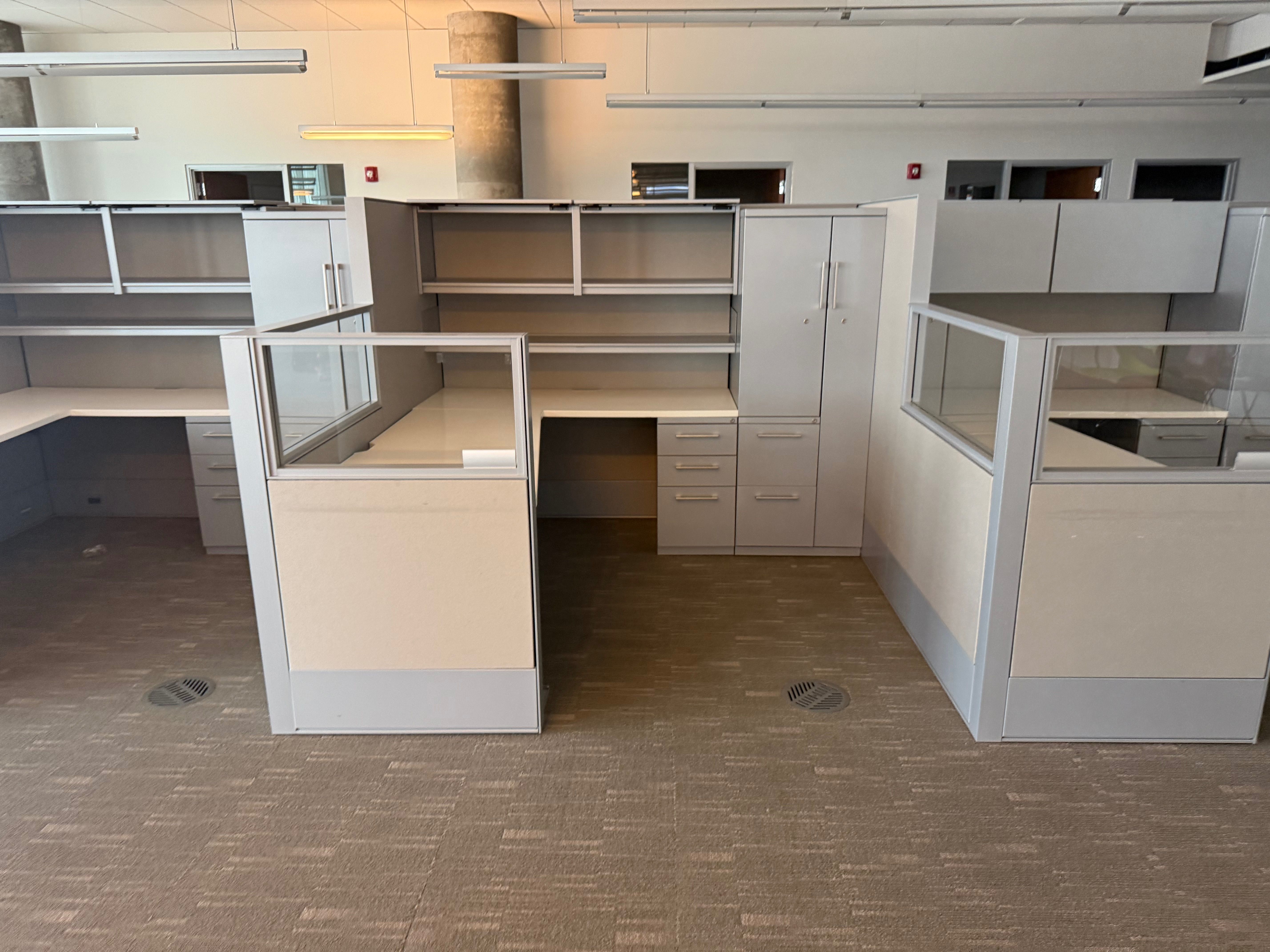 We have these Haworth Compose Manager stations that are in excellent condition that are standard in 7'x7''x65" with glass panels and wing. We can also make these stations into 5'x7', or 5'x6' without the wing panel. We also have various size panels to make other custom sizes if need be. The spline is (1) 60" panels and (1) 24" panel. The Spline has (2) 30" overheads, (1) BBF Pedestal, (1) 24" storage tower. Coming down the aisles way panels the sizes are (2) 42" panels. The wing panel is 30" and with glass. The surfaces are 6'x30/24" main desk, 60"x24" return. The fabric is neutral and the trim silver with the surfaces being white. $799.00 each cluster formation $899.00 each straight-line formation
