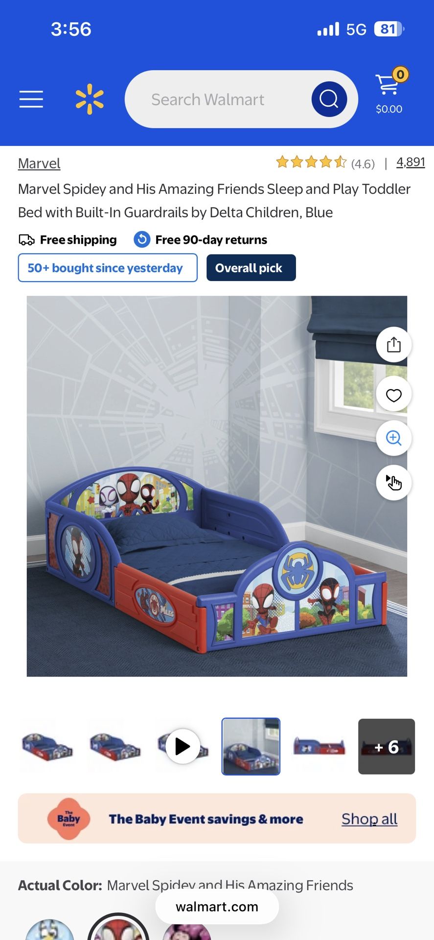 Spider-Man toddler bed perfect size for the transitioning from baby crib to bed. It’s directly on the floor not high at all easy to get in and out from. Nothing‘s wrong with it plastic is in perfect condition but it is missing some stickers