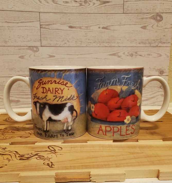 Set of Vintage Cracker Barrel Farmers Market collection mugs, featuring artwork by Susan Winget. Each mug features a different design, "Fresh Apples" design. "Sunrise Dairy Fresh Milk" design They are ceramic mugs, dishwasher and microwave safe. In Excellent condition, bright, no scratches on artwork. These beautiful nostalgic collection of mugs from 1998 early 2000, are no longer sold in Cracker barrel country store.