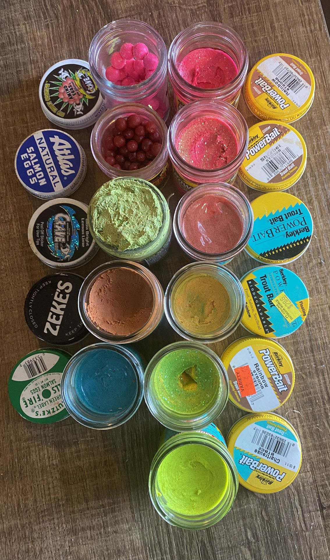 Lot of 11 Vintage Trout Fishing Baits Powerbait Zekes etc. in Rare Glass Jars These older-style jars and labels make them great for collectors, display, or anglers who enjoy vintage tackle items. These baits are discontinued and possibly older formulas. There are many Youtube videos on how to Turbo charge, revitalize or rehydrate these baits although these have good moisture. Some of the lids are mismatched. See pics for condition. Thanks for Looking. Relavant: Shimano Daiwa Mitchell Zebco Penn Abu Garcia Pflueger Avet Bait-caster Spin-cast Lb Test Bearings Jig Berkley Rapala Megabass Livetarget Strike King Yo-Zuri Heddon Spro Lucky Craft Panther Martin Big Bite Baits Mepps Rooster Tail Trout Magnet Spinner Rebel Minnow Kastmaster Spoon Keitech Worm Buoyant Hellgrammite Spirex Sidestab Quick-fire Symetre Aero Rear Front Drag Apache Trout Arctic Grayling Bigmouth Buffalo Black Bullhead Black Crappie Bluegill Brook Trout Brown Trout Channel Catfish Cutthroat Trout Desert Sucker Flathead Catfish Gila Trout Green Sunfish Largemouth Bass Northern Pike Rainbow Trout Redear Sunfish Roundtail Chub Smallmouth Bass Striped Bass Tilapia Tiger Trout Walleye White Bass White Crappie Yellow Bass Yellow Bullhead Yellow Perch Estate Yard Sale Today Need Gone Free Gratis Venta de Garage Tianguis Clearance Liquidation Sale Trout and Panfish Bait Garlic Woods Canyon, Willow Springs, Big Lake, Show Low Lake, Greer Lakes, Reservation Lake, Hawley Lake. Pesca Pescar Gila River!