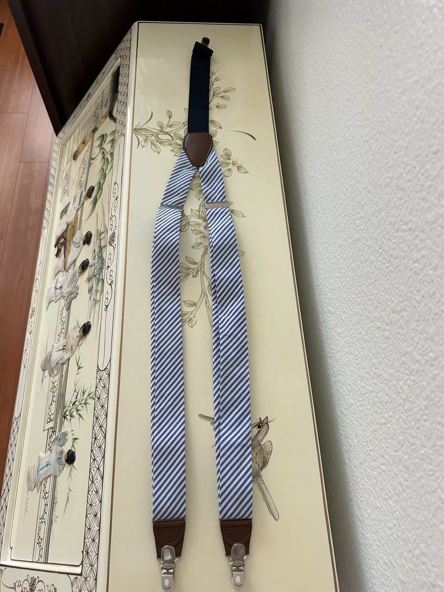 Like New! Seersucker Striped Suspenders w/Brown Faux Leather Accents