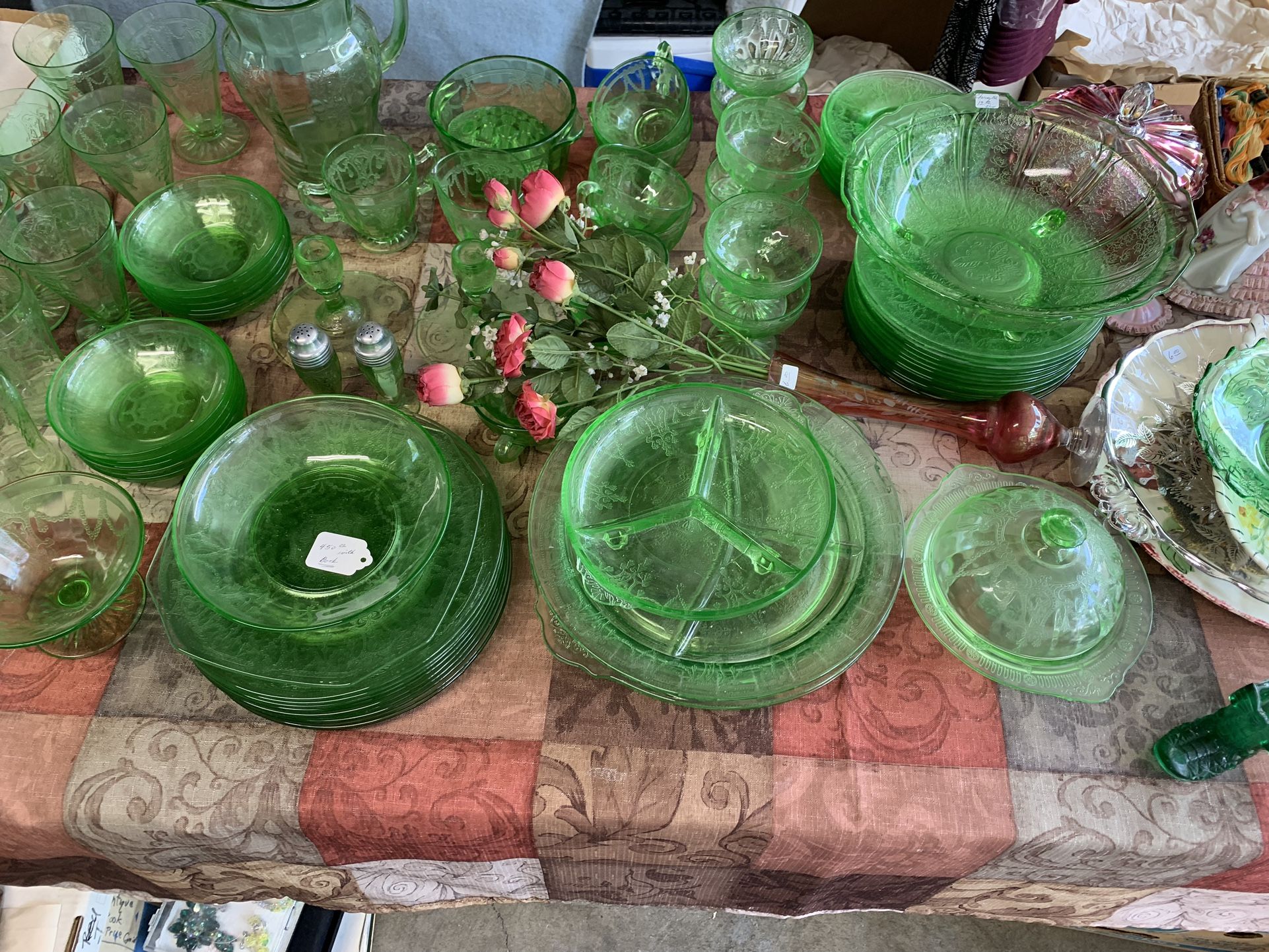 86 Pieces of beautiful green depression glass. Including 6 cone shaped tumblers, 6 round tumblers, 10 lunch plates, 9 dinner plates, 11 cereal bowls, 10 sherbets, a pair of candle sticks, salt and pepper shakers, butter dish and lid, ice tub, pitcher, sugar and creamer, cups and saucers and more. To be sold as a set only. Buy it all! No shipping, pick it up in Dixon, CA