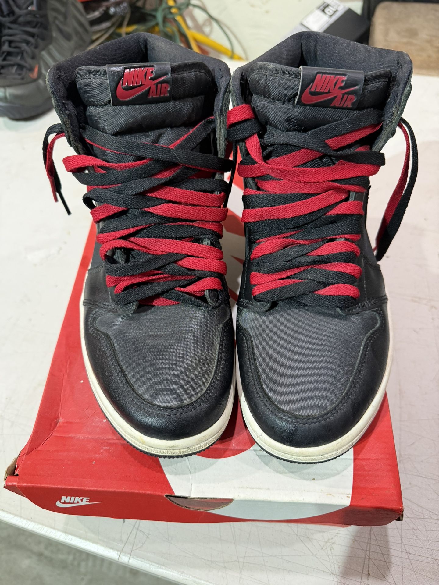 Jordan 1 satins with red and black laces Size 9.5 Good condition No bo Asking 80 OBO Willing to negotiate Open to trades Could use a little wiping down since been in storage for a little while. If you have any questions or need more info please message. Only selling to get money to help out with expenses. Please check out my other listings