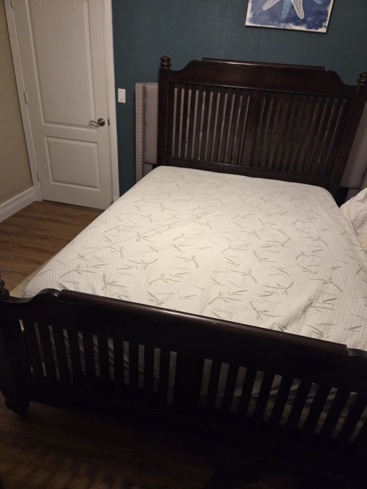 Queen size bed, headboard, foundation, real wood and Queen Size Mattress