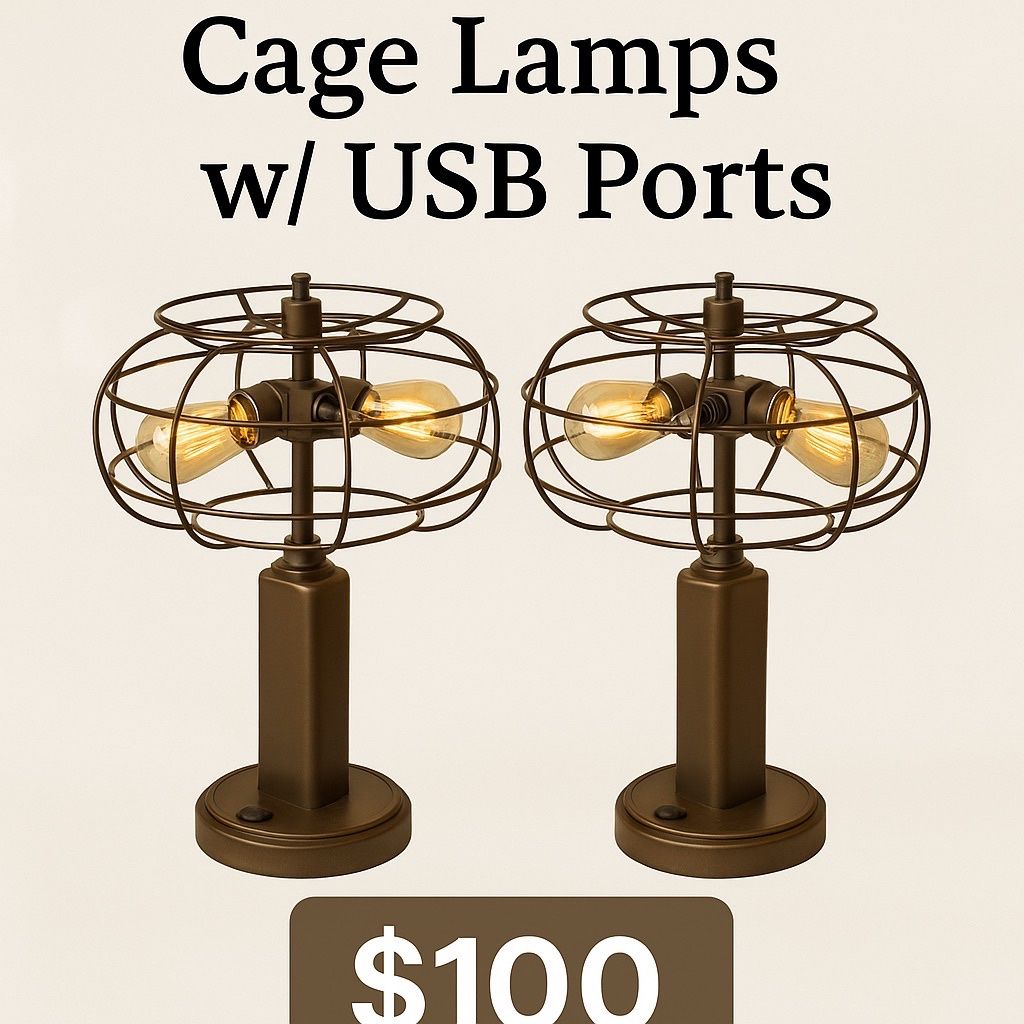 Set of two matching industrial bronze cage table lamps with Edison bulbs and USB ports in each base. Perfect for nightstands, desks or accent tables. Both lamps tested and worked great, including USB charging ports. Bronze metal design cage Edison style lightbulbs included built-in USB ports one per lamp. Height is approximately 16 inches cage diameter around 7 inches.