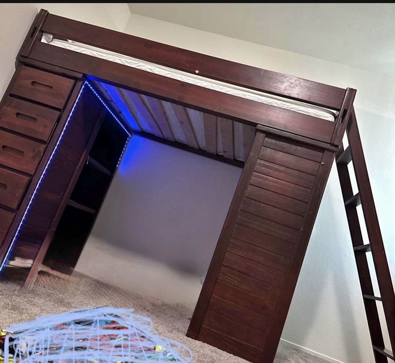 $160 Normal wear and tear -solid wood twin size very nice sturdy bed - excellent for a small room that needs more storage space - no mattress Comes with built in desk under the bed Has drawers as well Pick up in Hanford by dmv - will deliver in Hanford or Armona for $25 extra Hablo español Desgaste normal – cama de madera sólida, tamaño twin, muy bonita y resistente. Excelente para un cuarto pequeño que necesita más espacio de almacenamiento. No incluye colchón. Incluye escritorio integrado debajo de la cama. También tiene cajones. Recoger en Hanford, cerca del DMV. Entrega disponible en Hanford o Armona por $25 adicionales