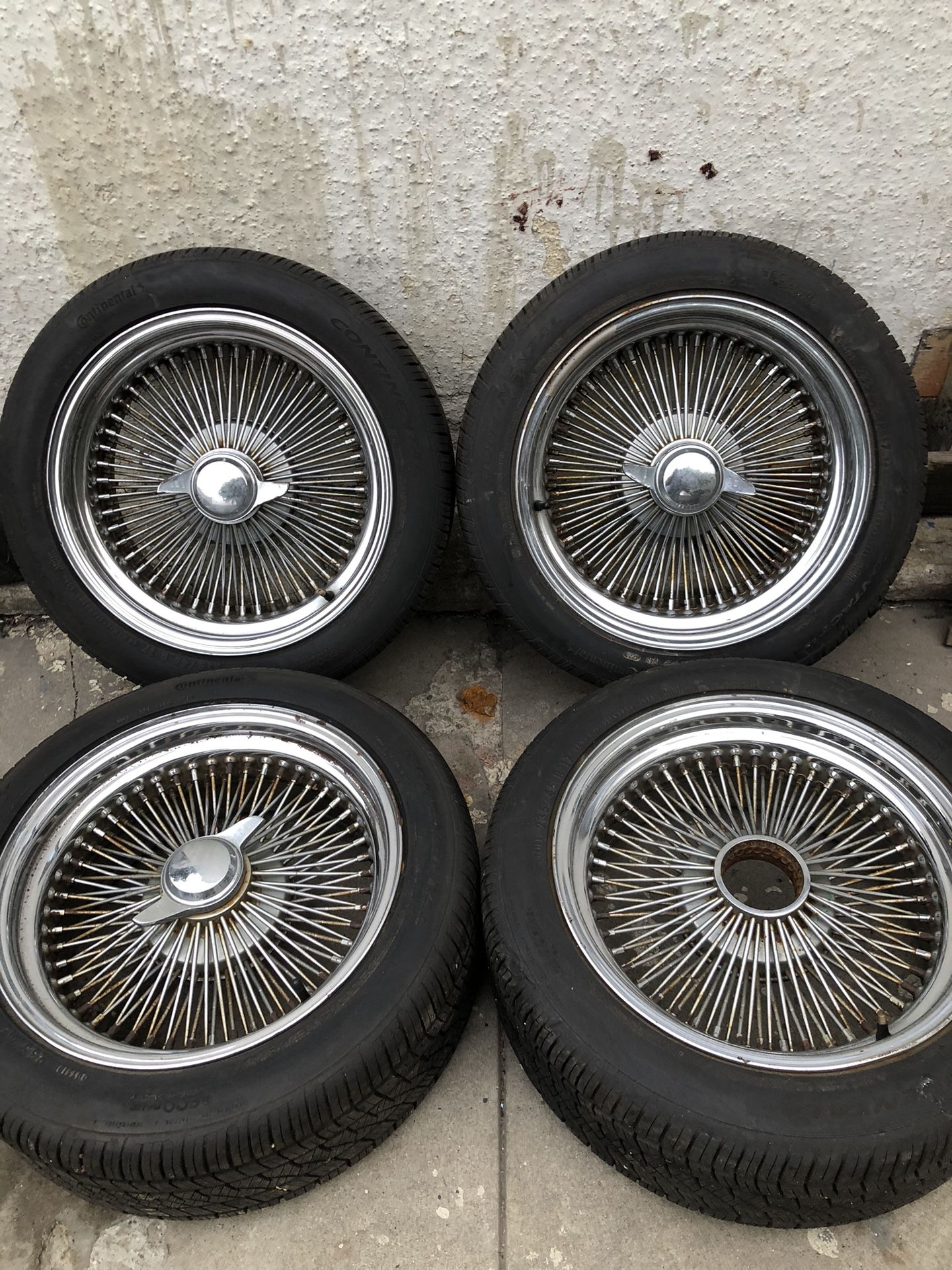 17” wire spokes wheels with 235/45/17 Continental tires 80% life they do have some rust 5 lug universal adapters missing one knock off asking $400 /////// 14” cragar American racing wheels 5x4.75 Chevy tires are rollers $300 //////click on my page to check out my other wheels parts and projects west Adams part of Los Angeles WLA 90007 USC AREA