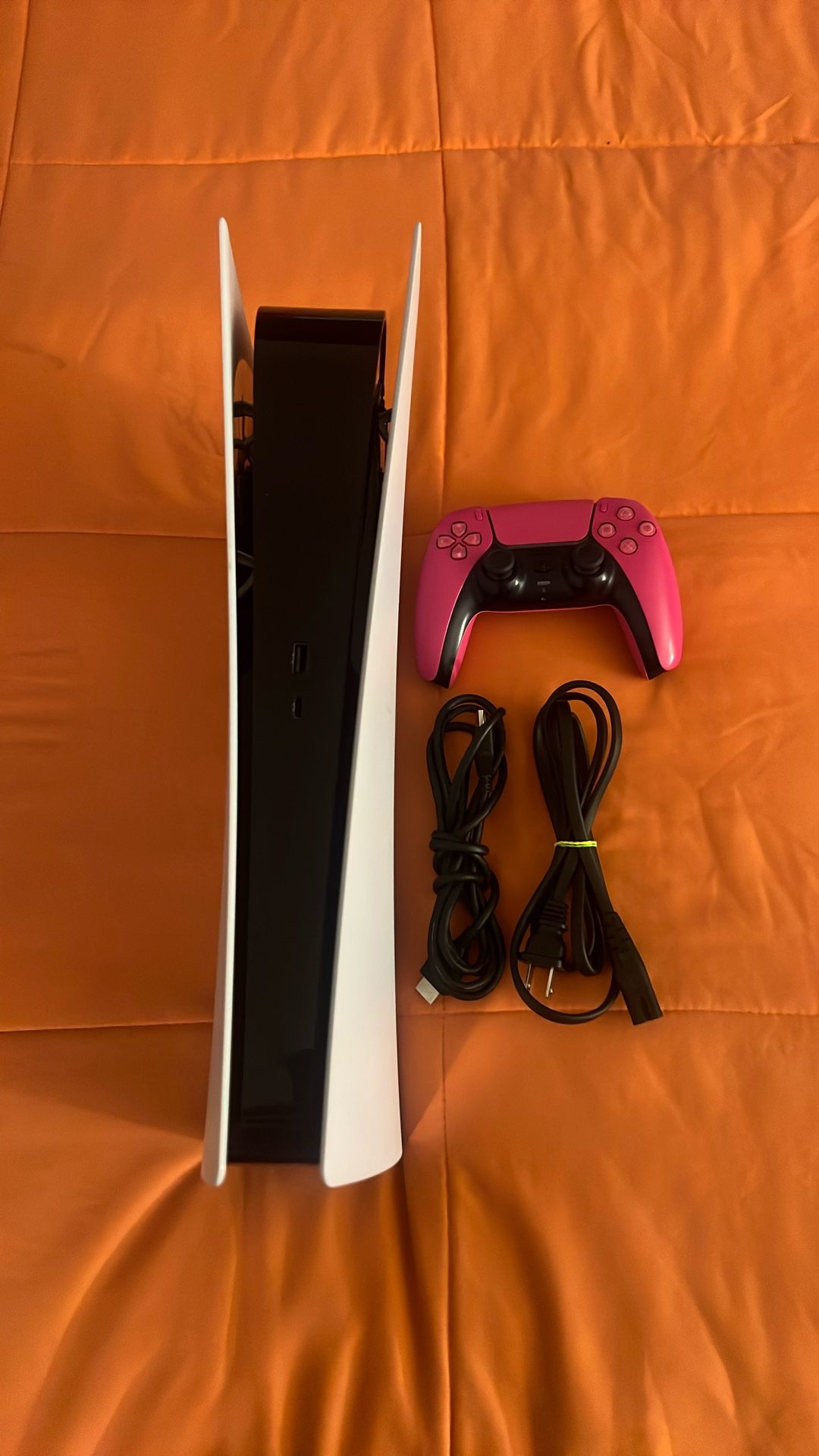 Used PS5 but works as brand new. Comes with pink PS5 DualSense controller. Also comes with power cord and hdmi cable.