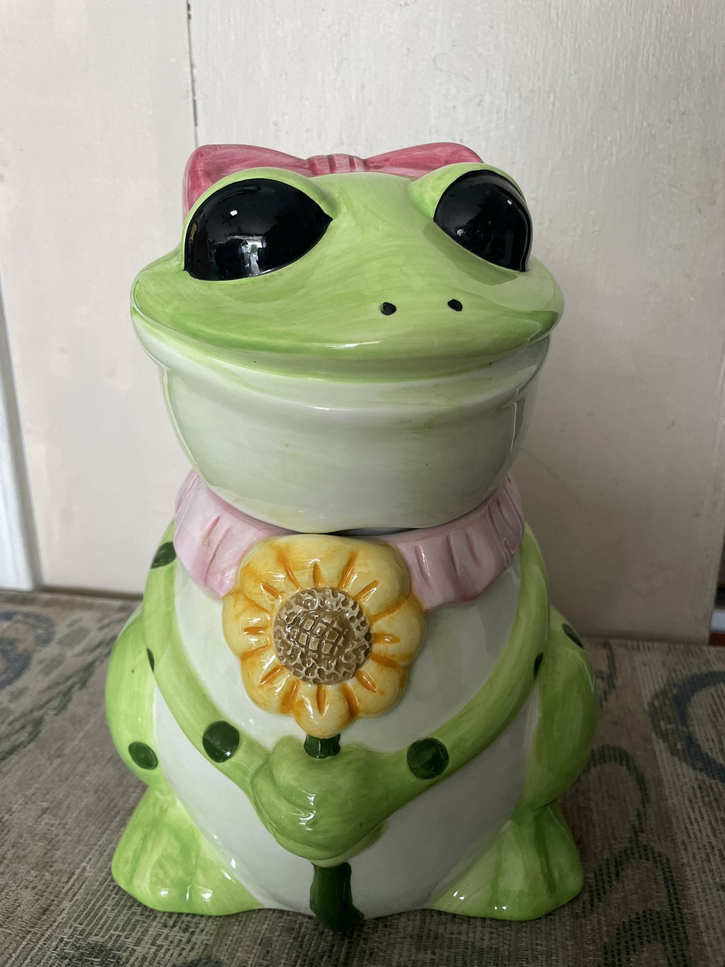 Super cute vintage ceramic cookie jar in excellent condition- frog with pink bow holding a sunflower! Measurements are on the pics-