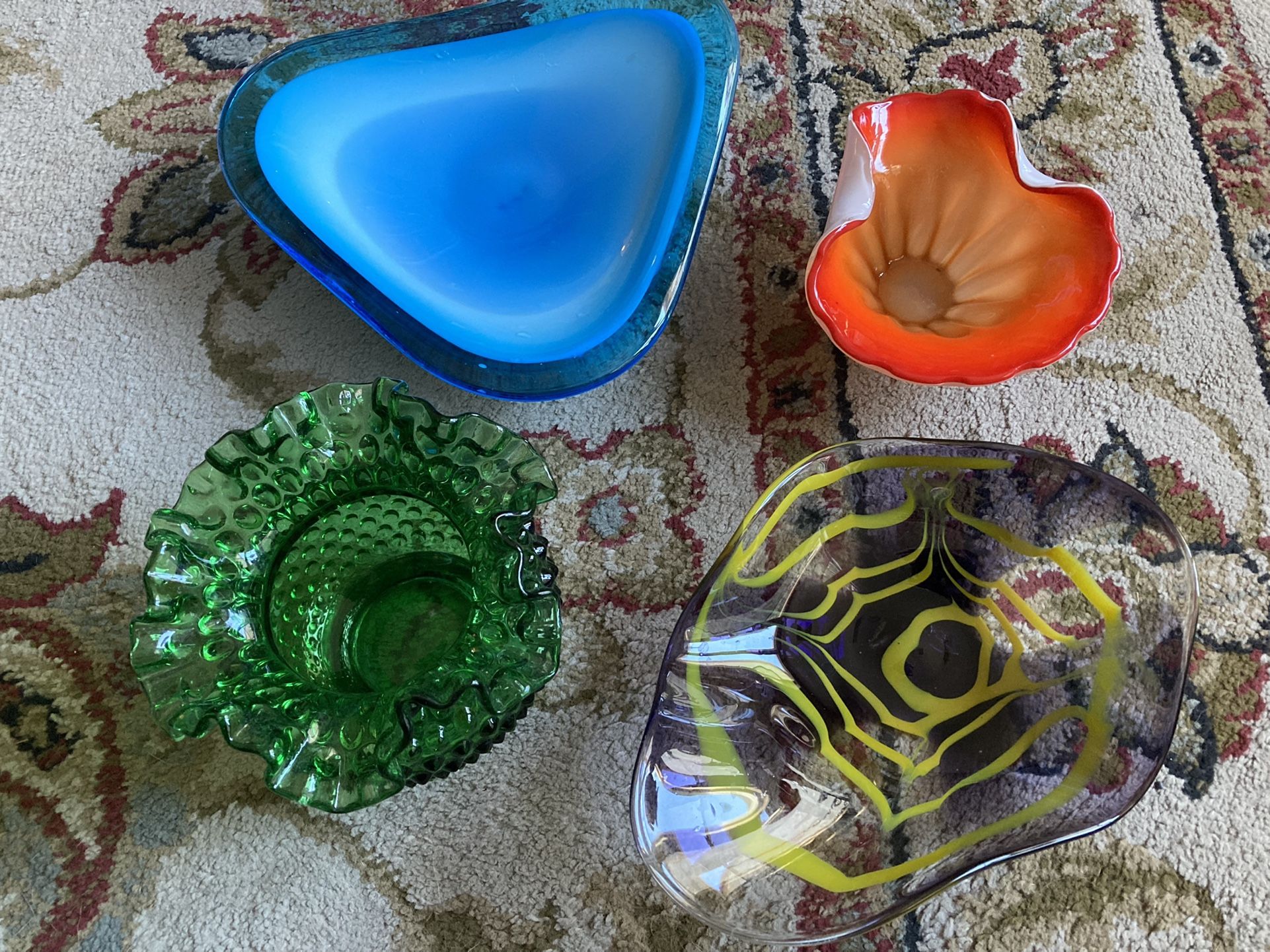 Vintage hand blown glass pieces all unique one-of-a-kind green one is hobnail glass very heavy as well as bright blue dish also very heavy orange one is smaller has nice curves clear one has purple in it and yellow that looks like a spiderweb all gallery quality glass Christmas is less than 90 days away makes a great gift Price is $25 for each piece