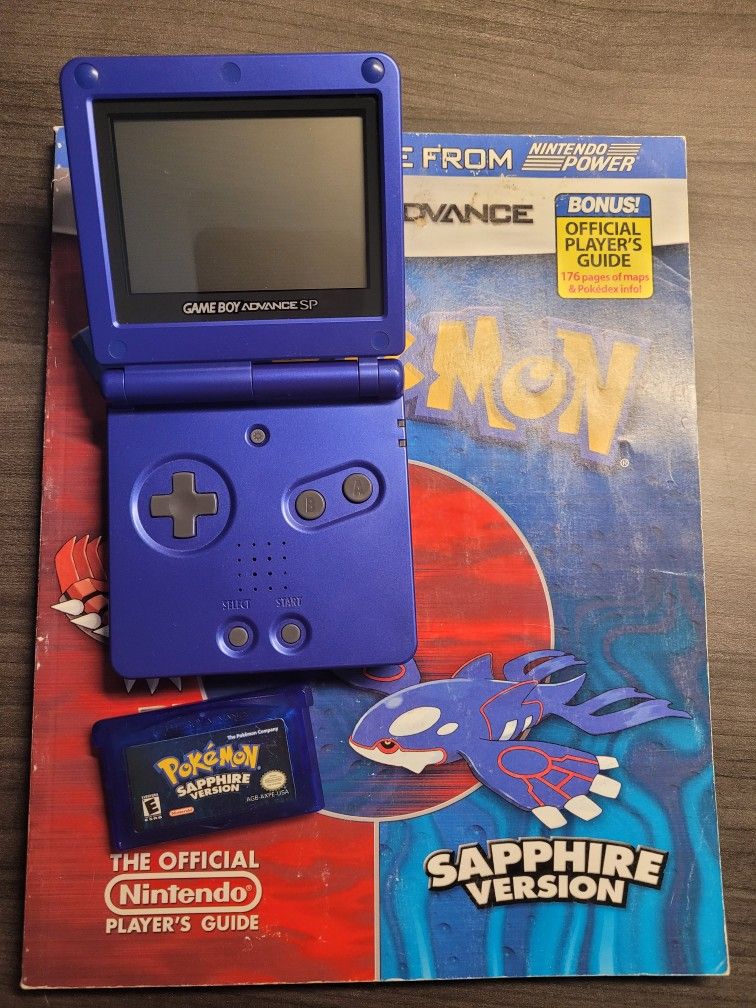 This bundle includes the Nintendo Game Boy Advance SP (Blue), Pokemon Sapphire Version, and The Official Game Guide. The console holds a charge and the game is tested and works. These are authentic Nintendo products.
