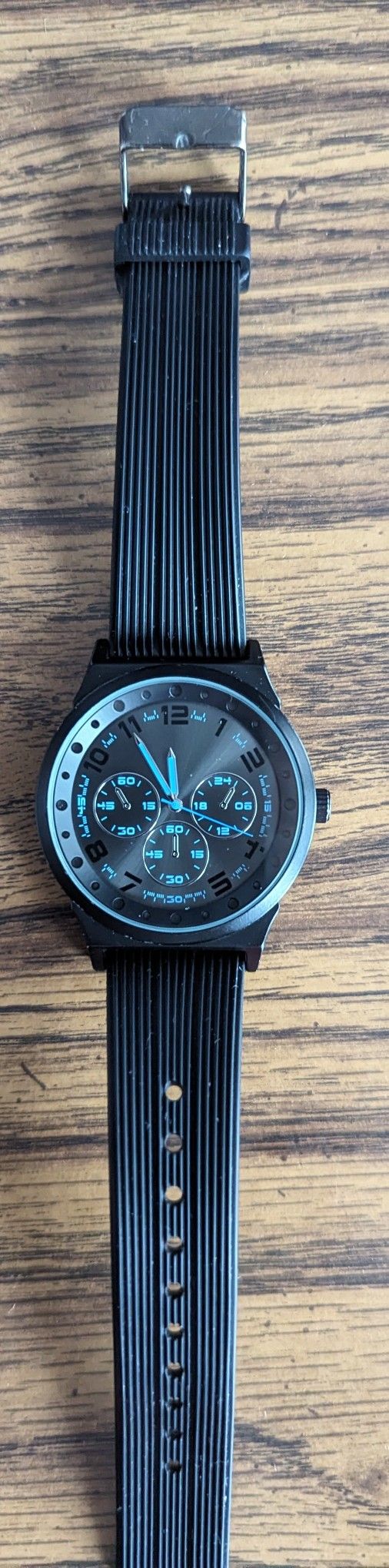 Simple casual black watch with blue accents in the watchface. Slightly used but in great condition.