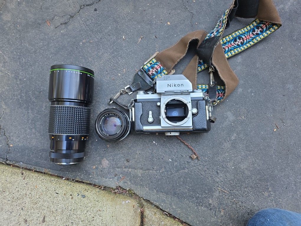 Vintage Nikon F Camera With A 50mm And A 300mm Lense