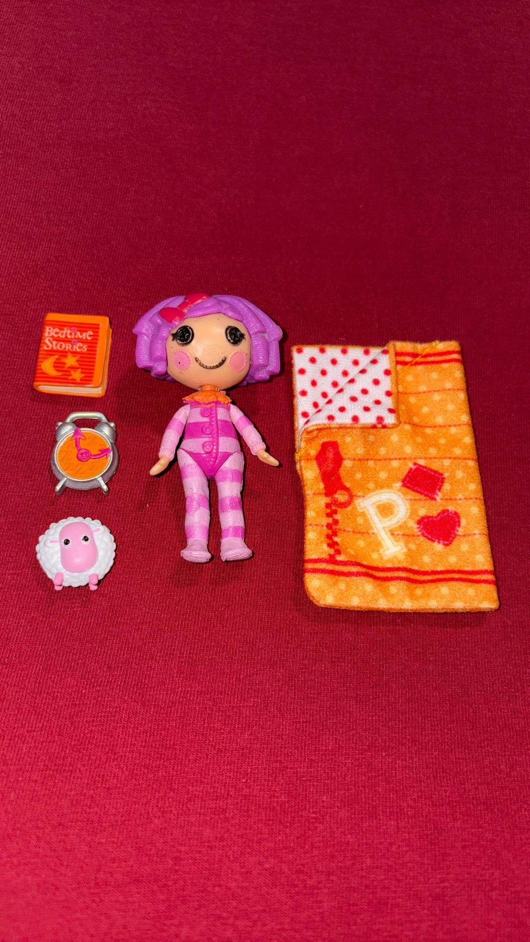 Lalaloopsy mini doll Pillow Featherbed. Pajama & sleeping bag a clock a book a pet. The Lalaloopsy doll can go in the sleeping bag. Look at pictures to see what you’re getting First come first serve. Pick up only cash only.