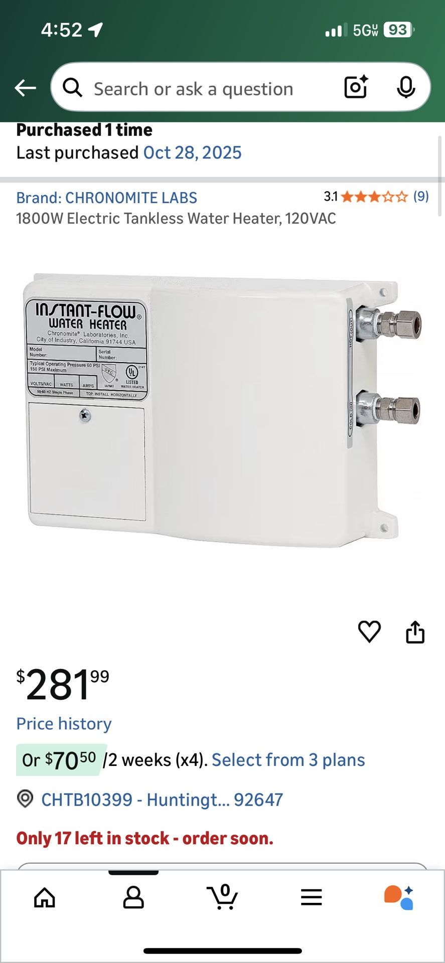 New!! 1800W Electric Tankless Water Heater, 120VAC Bought 3 but only ended up using 1 pd 281+ tax for each I have 2 available selling $250 each Pick up Yorba Linda
