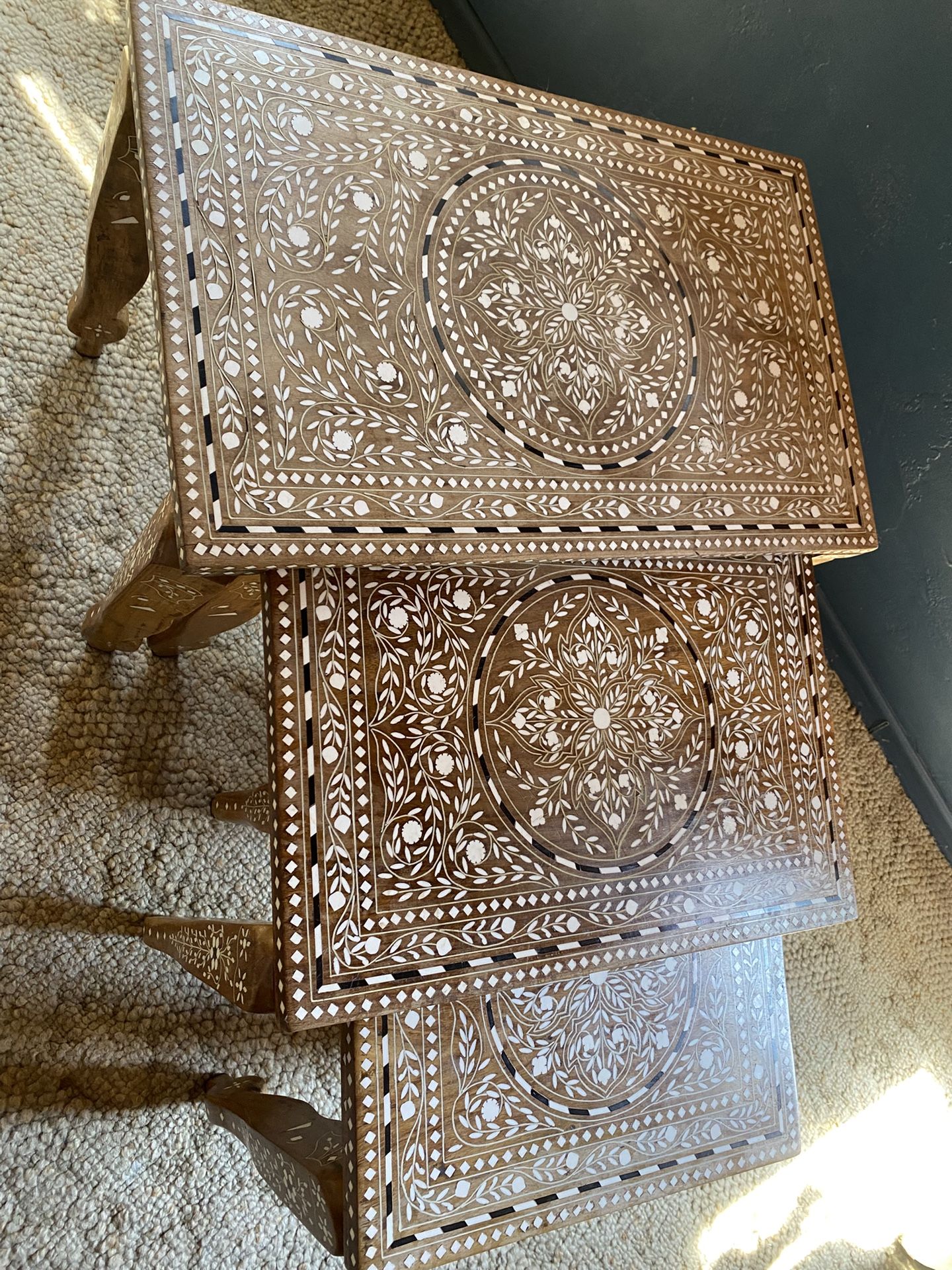 Southeast wood hand carved and inlaid with white, could be shells. In perfect condition. No cracks dents splits. Each is adorned with exquisite floral mandalas and delicate vine etchings, adding a touch of artisanal charm to your decor. The stackable design allows for versatile arrangement and space-saving convenience,