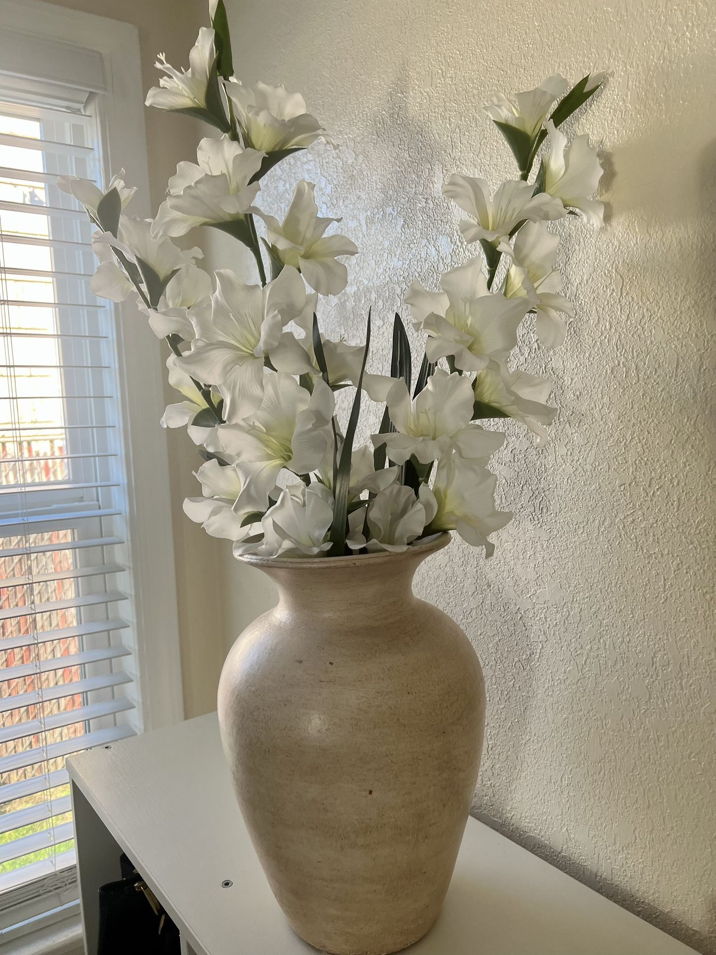 beige color vase with 3 faux white gladiolus $40 flowers from ikea, original price $12.95 each one