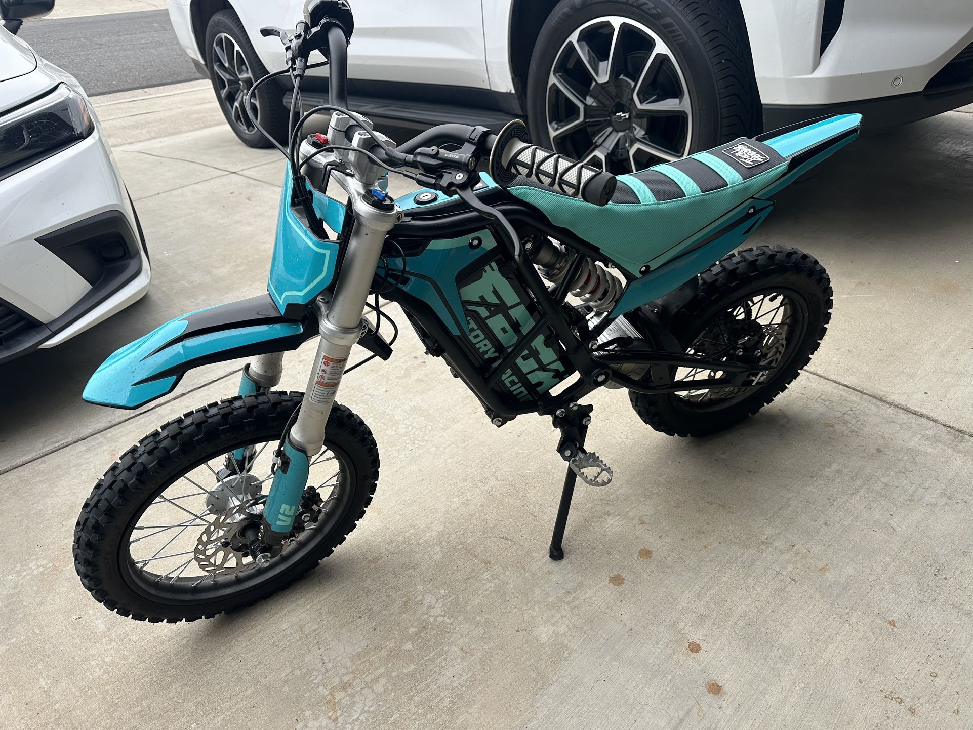 Please do not message me to trade. My son does not want to trade. EBOX2 is a lightweight 2kW electric minibike (mini motocross bike) with upside down forks and mono rear shock. It features a lightweight 60v 18,2Ah Lithium Battery and brushless DC motor / controller. After market grips, upgraded seat cover, and drop pegs installed. Bike is about a year old. My son wants to move on to a pedal assist e bike.