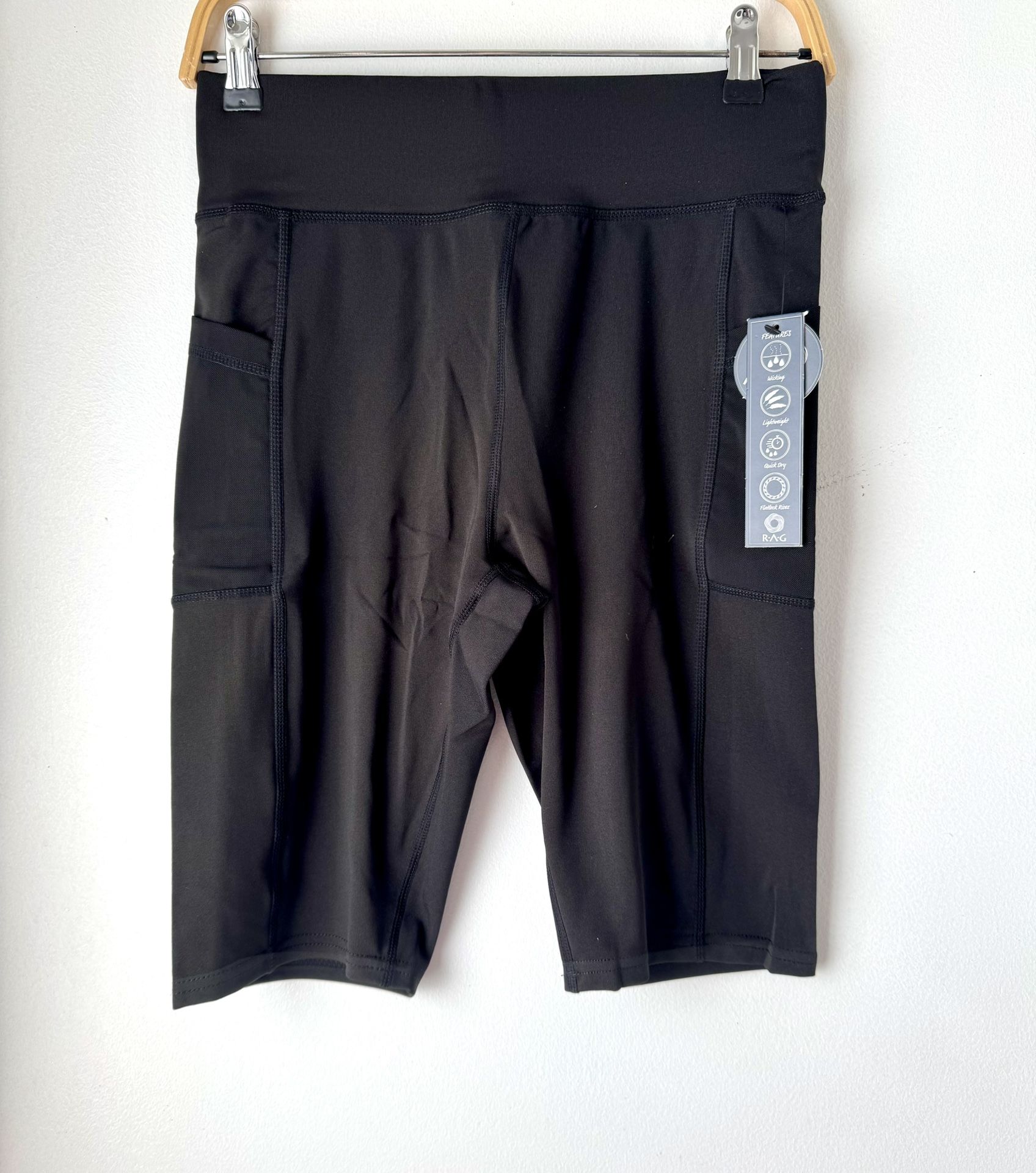 Women’s Activewear Shorts, Jet Black. Size Large. Measurements: Waist 28”, Length 20”, Inseam 10”. Side Pockets. Polyester/Spandex. NWT. (1048) #activewear #athleticshorts #womensactivewear #activewearshorts #rag