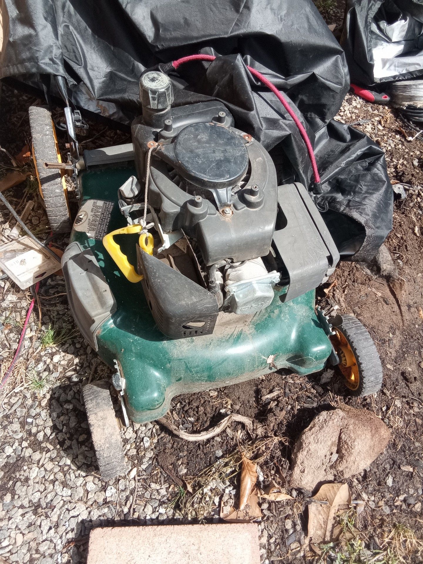 Lawnman mower havent dewinterized needs a couple of pull cover nuts and a lil oil and fuel lines are fresh. If you want to try and start it it needs gas and oil. Should crank right over though. It's a mulcher right now the bag got ripped last season.