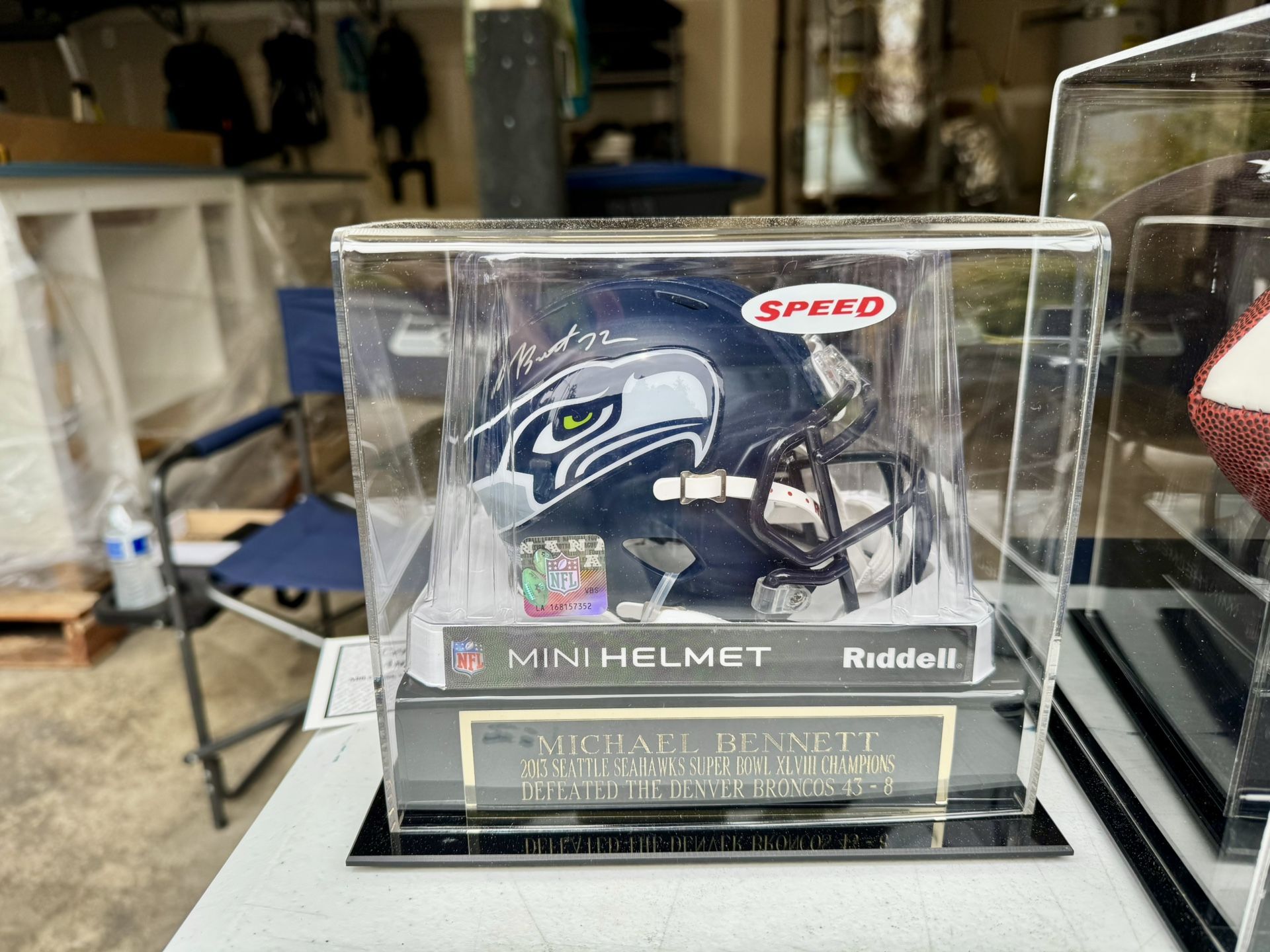 Signed Michael Bennett mini helmet with authenticity card. In a case.