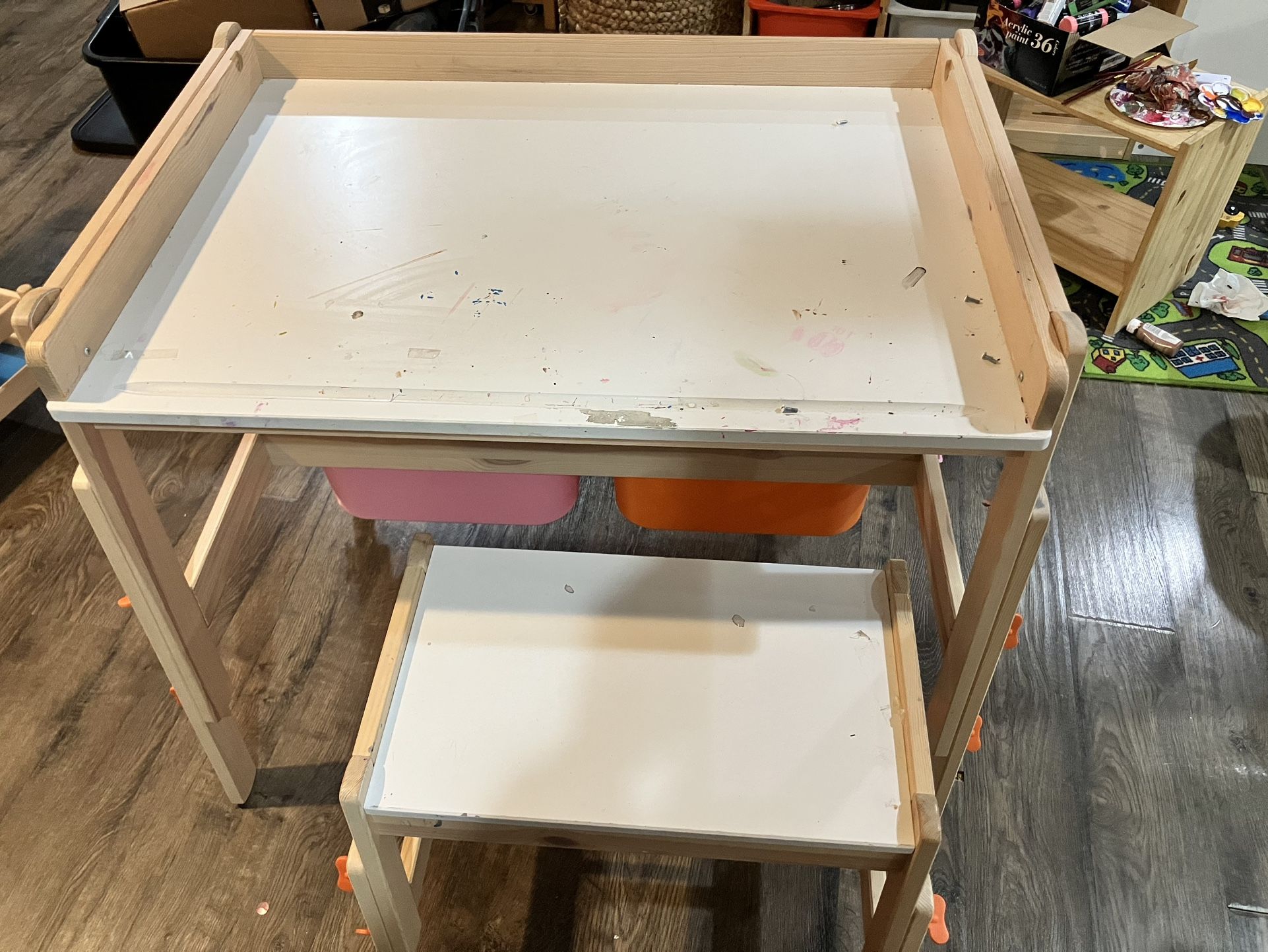 Sturdy, adjusted IKEA table with built in storage. It comes with a matching chair. I also have a matching kids book π display.
