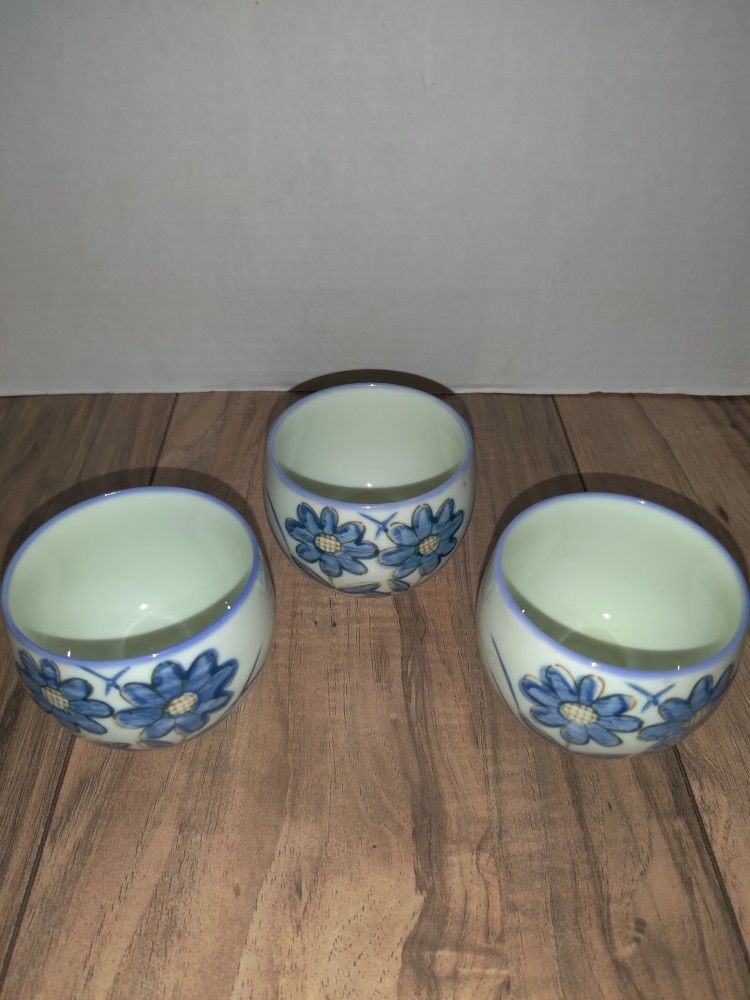 Vintage Asian Blue Flower Pattern Sake Tea Cup Set Of 3. One has a small chip shown in pictures. Sold as is.