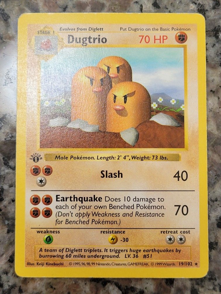 Vintage 1st edition base set Dugtrio! Rare card and perfect for someone's vintage collection.