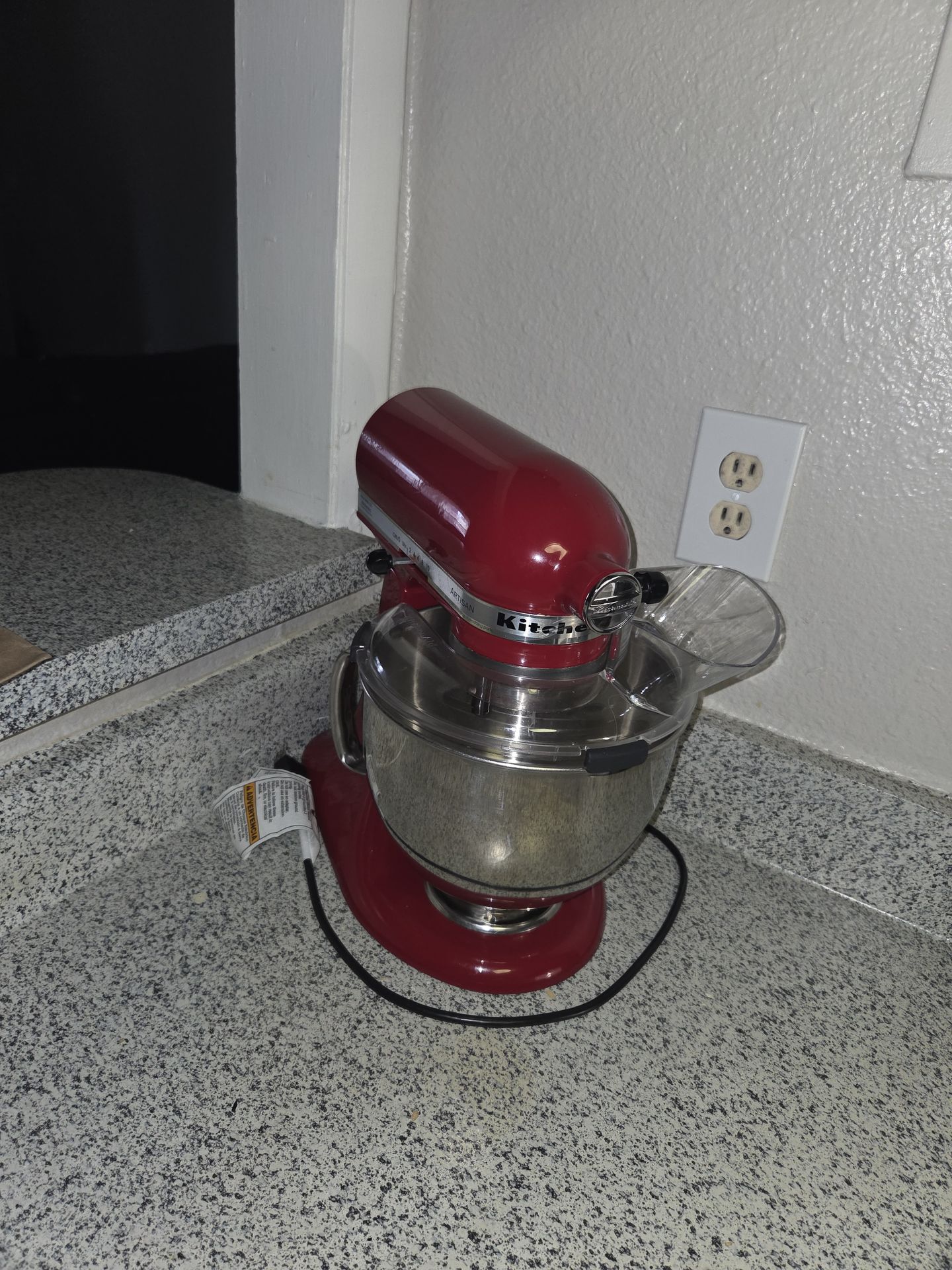RED, 4.5 QUART, excellent condition Kitchen Aid mixer, with all 3 Attachments included whisk, doudh/ hook and paddle. Cover included. Performs very well i dont use it often i have 2 other large mixers. Great deal as well these mixer start three hundred anywhere on the market.