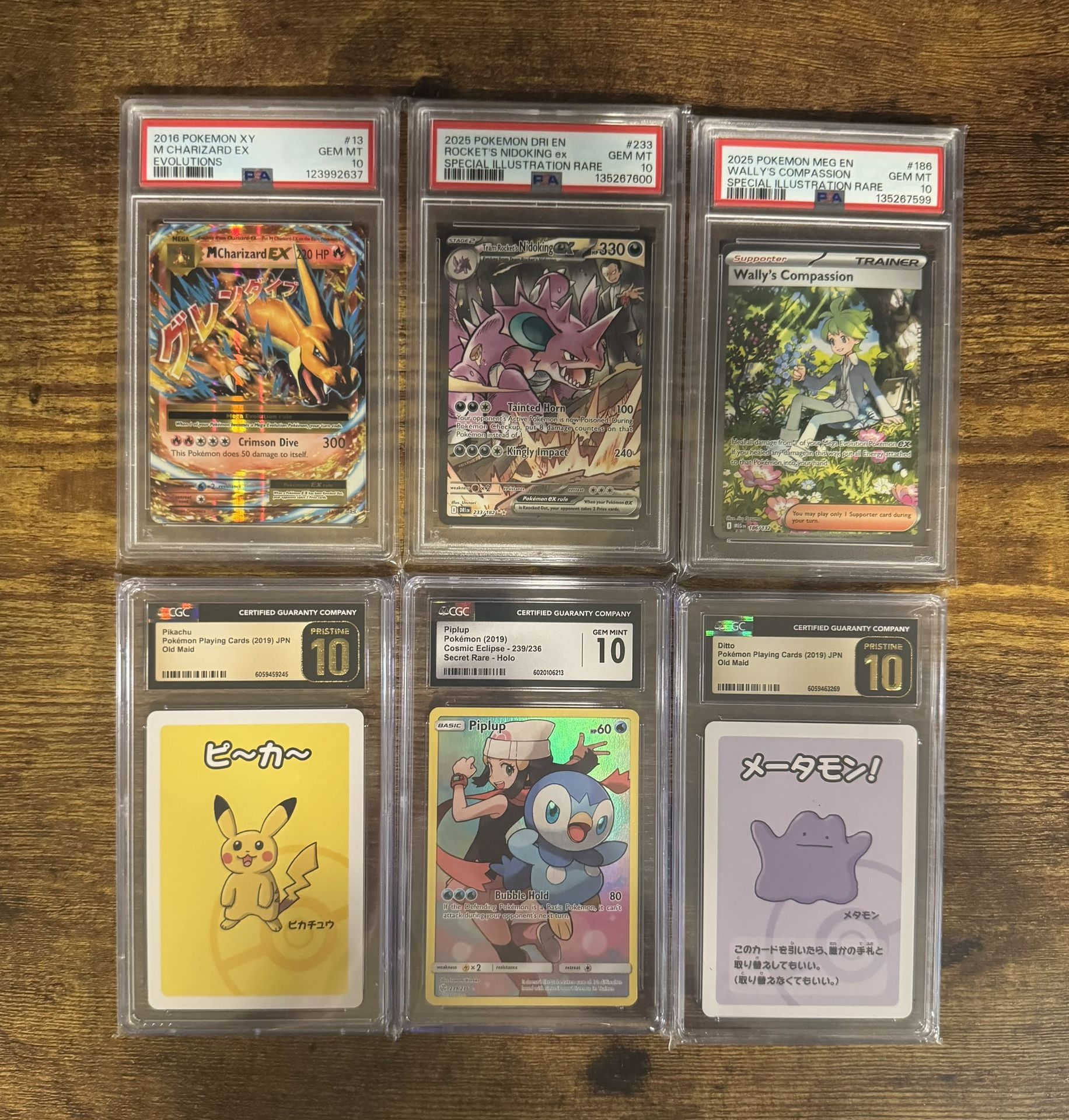 Lot of PSA 10 and CGC pristine 10 / Gem mint 10 graded Pokemon cards -PSA 10 M Charizard Ex 13 from Evolutjons -PSA 10 Team Rocket’s Nidoking Ex 233 from Destined Rivals -PSA 10 Wally’s Compassion 186 from Mega Evolution base set -CGC Pristine 10 JP Old Maid Pikachu -CGC Pristine 10 JP Old Maid Ditto -CGC Gem Mint 10 Piplup 239 from Cosmic Eclipse Looking to primarily trade for sealed product, PSA slabs (looking for PSA 10 Kingdra & Greninja SF promos), and some singles like promos and SIRs. Potentially interested in select baseball cards too