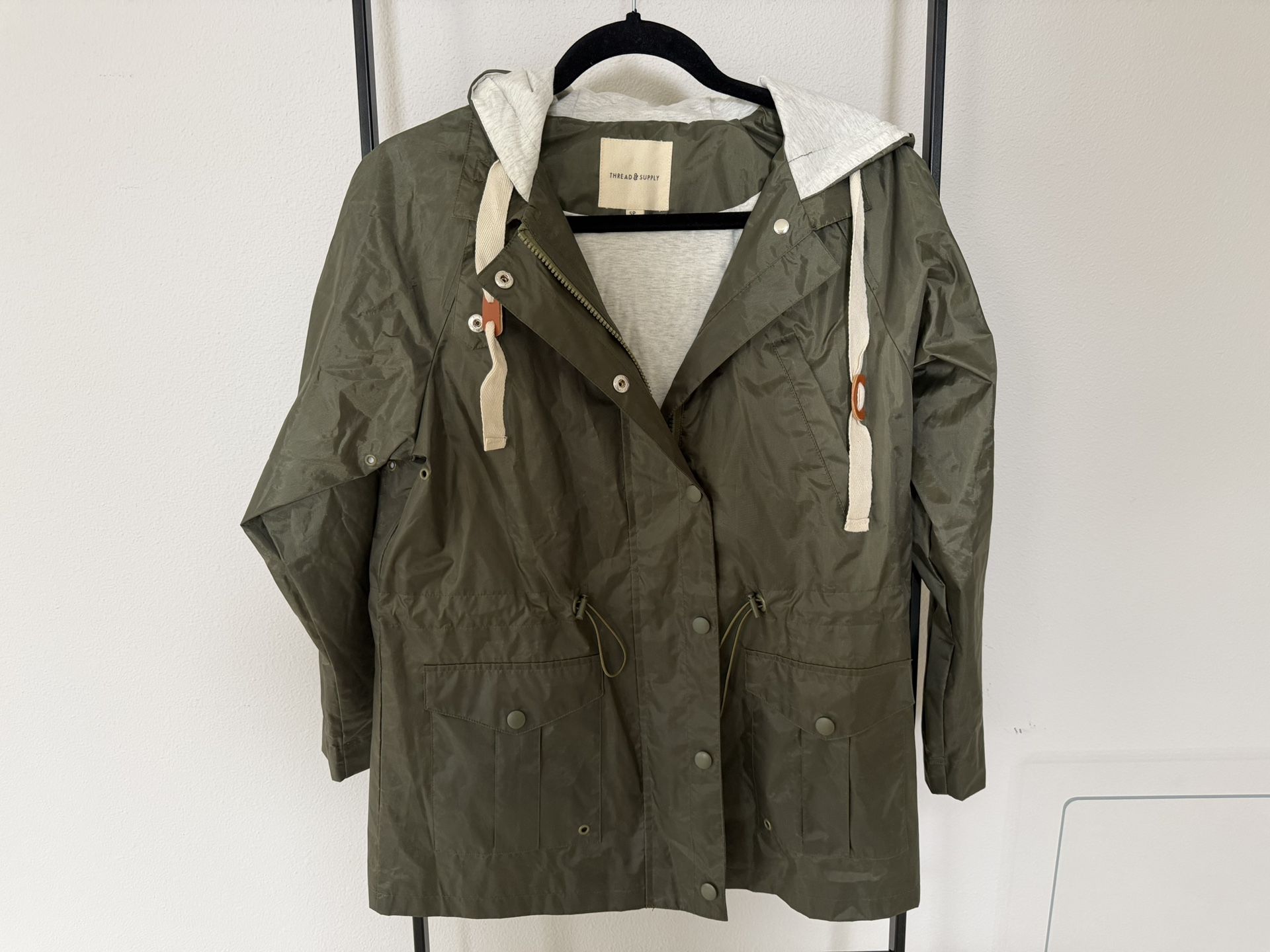 Used, like new. Worn only once. Size extra small petite. Thread & Supply olive green hooded utility jacket. Features a gray jersey-lined hood, snap + zip front closure, waist drawstring, and front pockets. Has ventilation holes. Lightweight rain/utility style. Great for spring and fall.