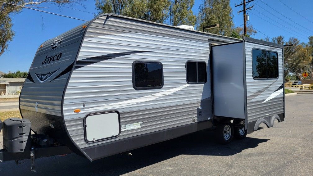 2021 Jayco 248 RBS .... SLIDE OUT ... 5400 POUNDS EMPTY..... Electric awning.... outside kitchen..... 6ft 8 " tall ceiling!....... full queen bed... 2 tvs ..... inside is absolutely like new ...... comes with everything you need to camp ... I mean everything!..... absolutely ready to use....... located in Wildomar CA Near Lake Elsinore area....... $15500