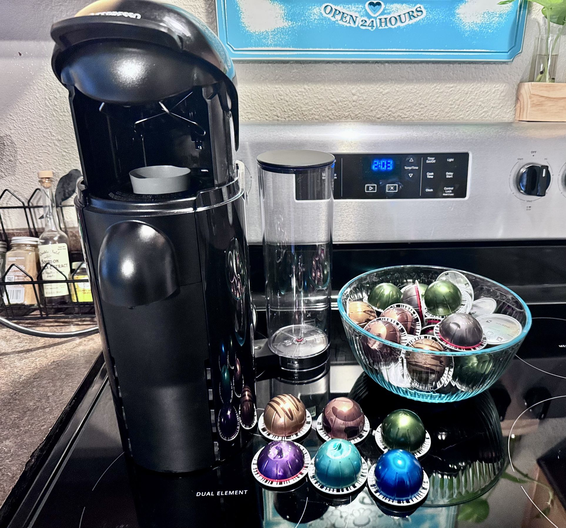 User but works great. Comes with about 30 pods (variety flavors) Missing cup holder but still works great.