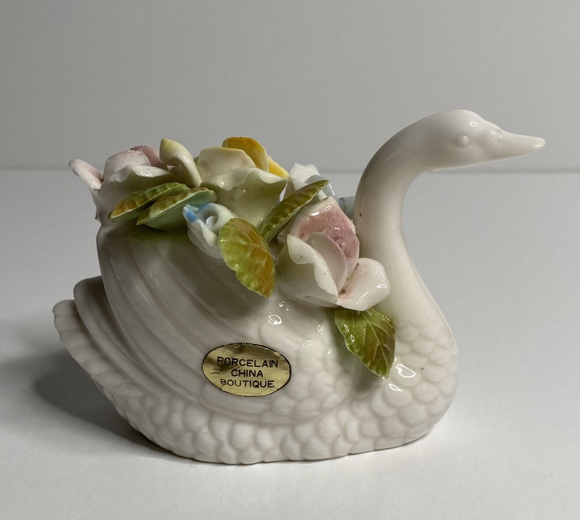 Vintage Porcelain China Boutique Swan with Flowers 4” Long X 3” Tall