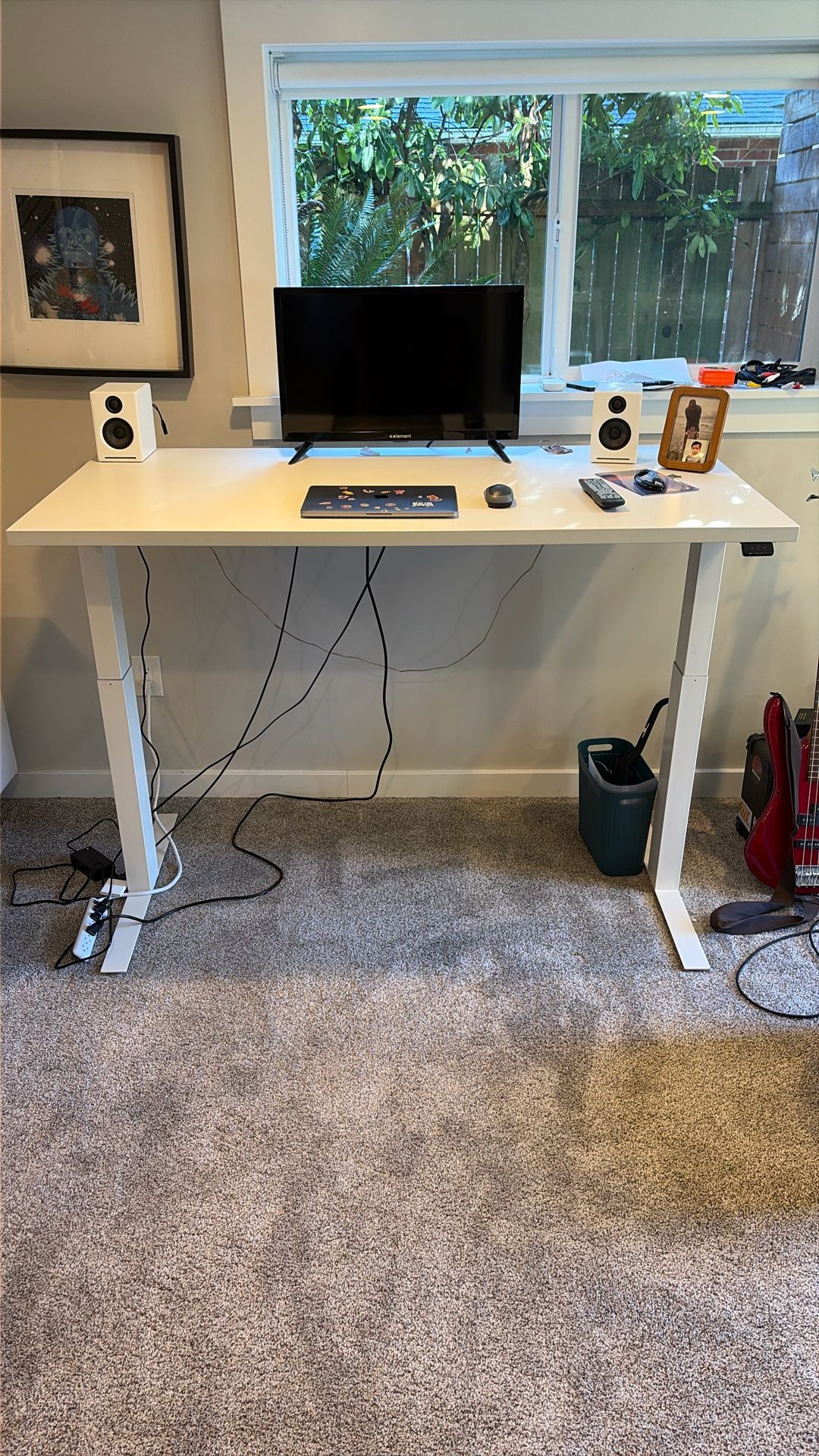 4.10 ft W x 2.5 ft D Electric stand with plug in. Lowest setting 2.3 ft, highest setting 4ft.