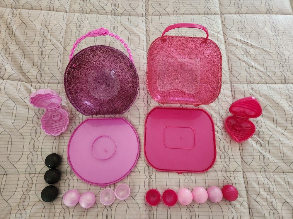 **Firm Price *** Two LOL SURPRISE! Large storage cases with handles and accessories inside them. There are 11 small ball like containers and 2 larger ones ( shell and heart shaped). Great for storage! (Toys, hair accessories, rings, necklaces, etc.) $17 for both, in excellent condition.