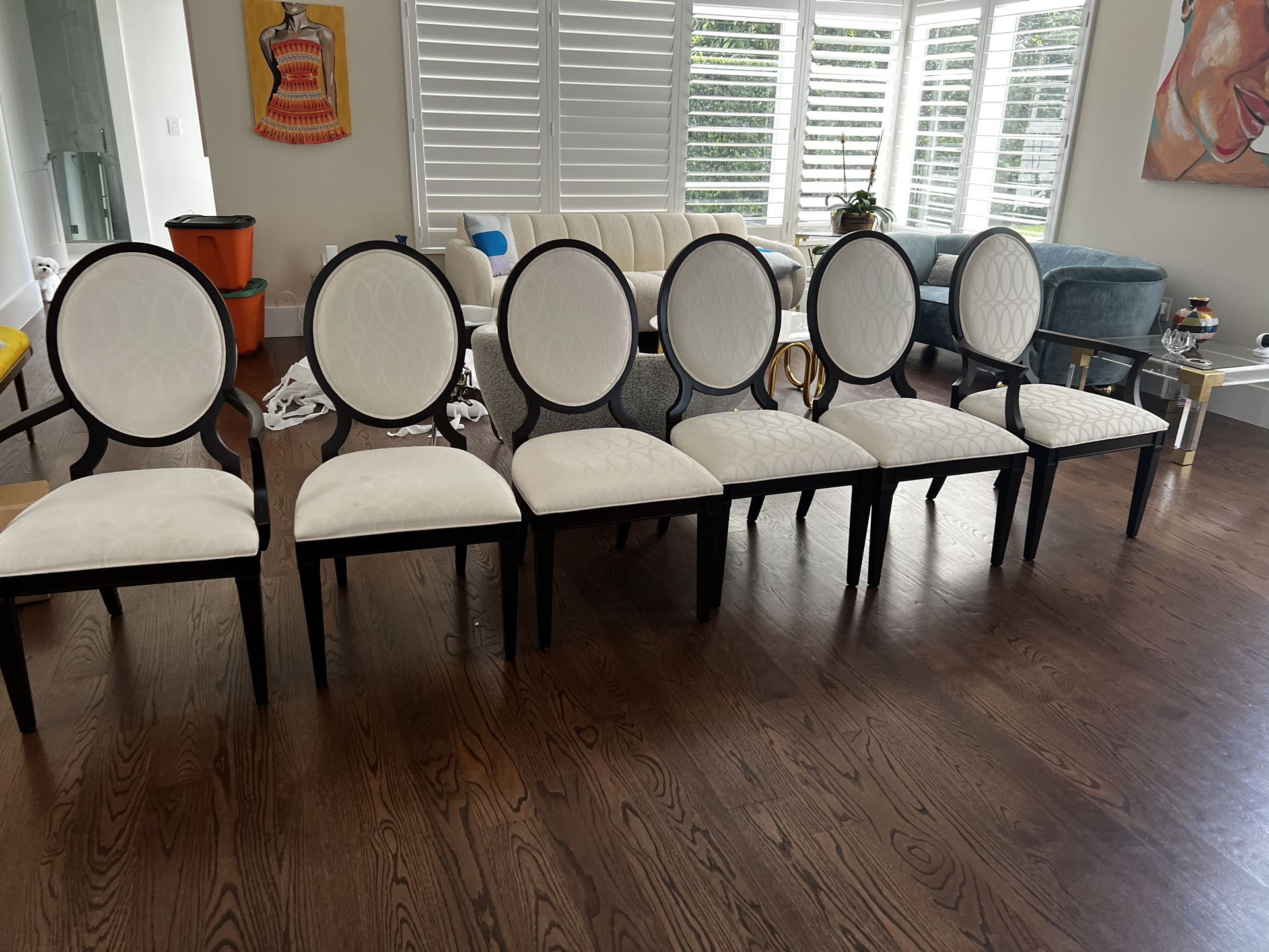 2 arm chairs 4 without arms. Ethan Allen, Lindsay, dining chairs, retail value $750-$900 each.