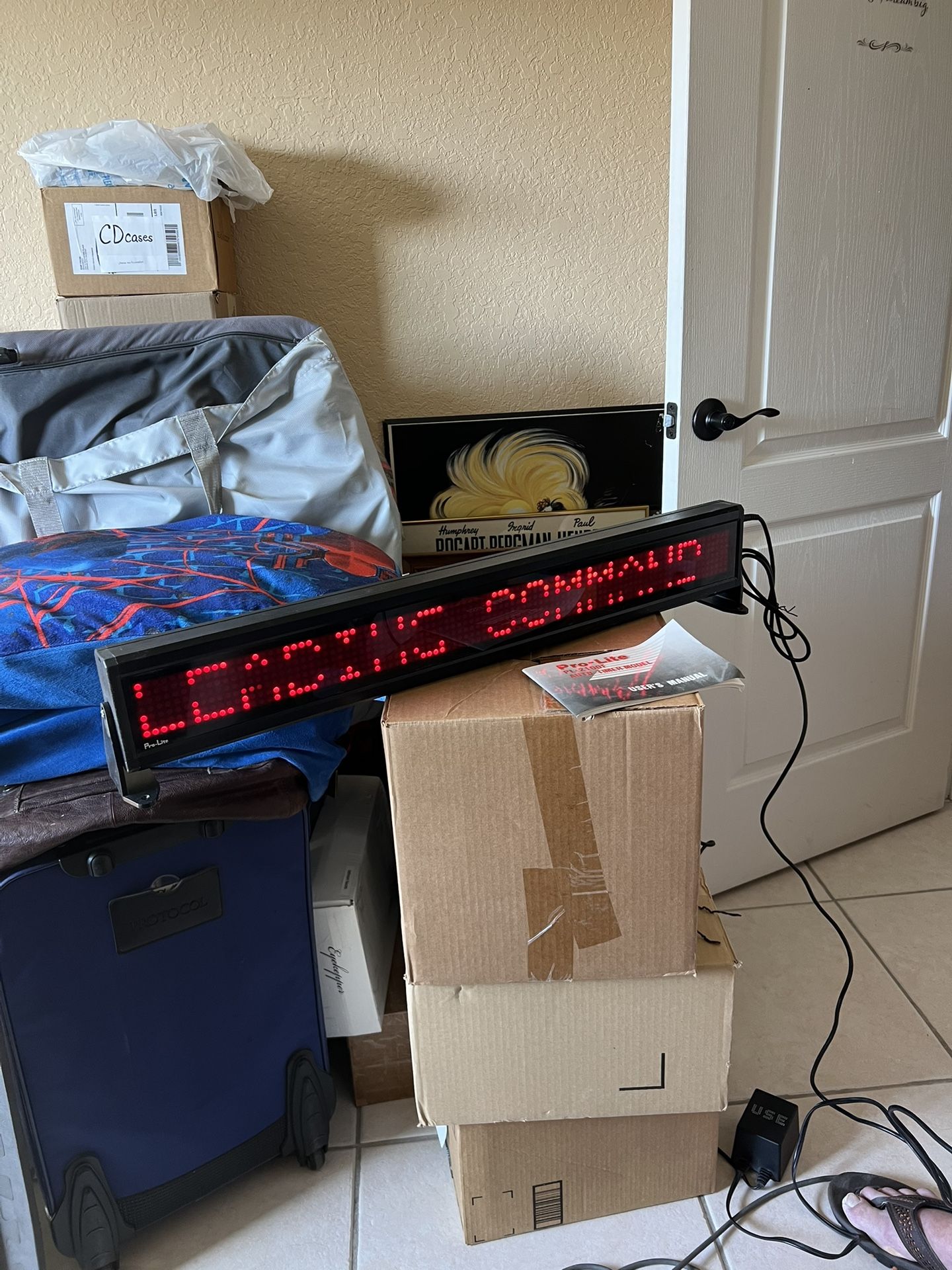 This is a programable sign that can be mounted on wall or just sat on cabinet. Screen area is 28 by 4 inches. It has many different programable styles to display any message you choose, from “happy birthday” to “you’re the apple of my eyes” to anything your heart desires. Lettering are only in red which makes it very clear and readable. Exact cash only accepted. Area of. SW 147 Ave and Coral Way in Miami Dade County.