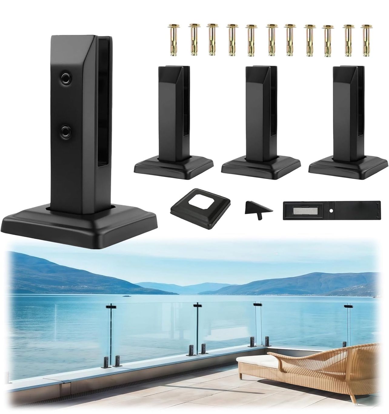 4 Pcs Glass Railing Spigots, 304 Stainless Steel Black Square Fence Clip, Glasses Balustrade, Glass Clamp Kit for Balcony Deck Pool, Stairs Indoor and Outdoor, Matte Black