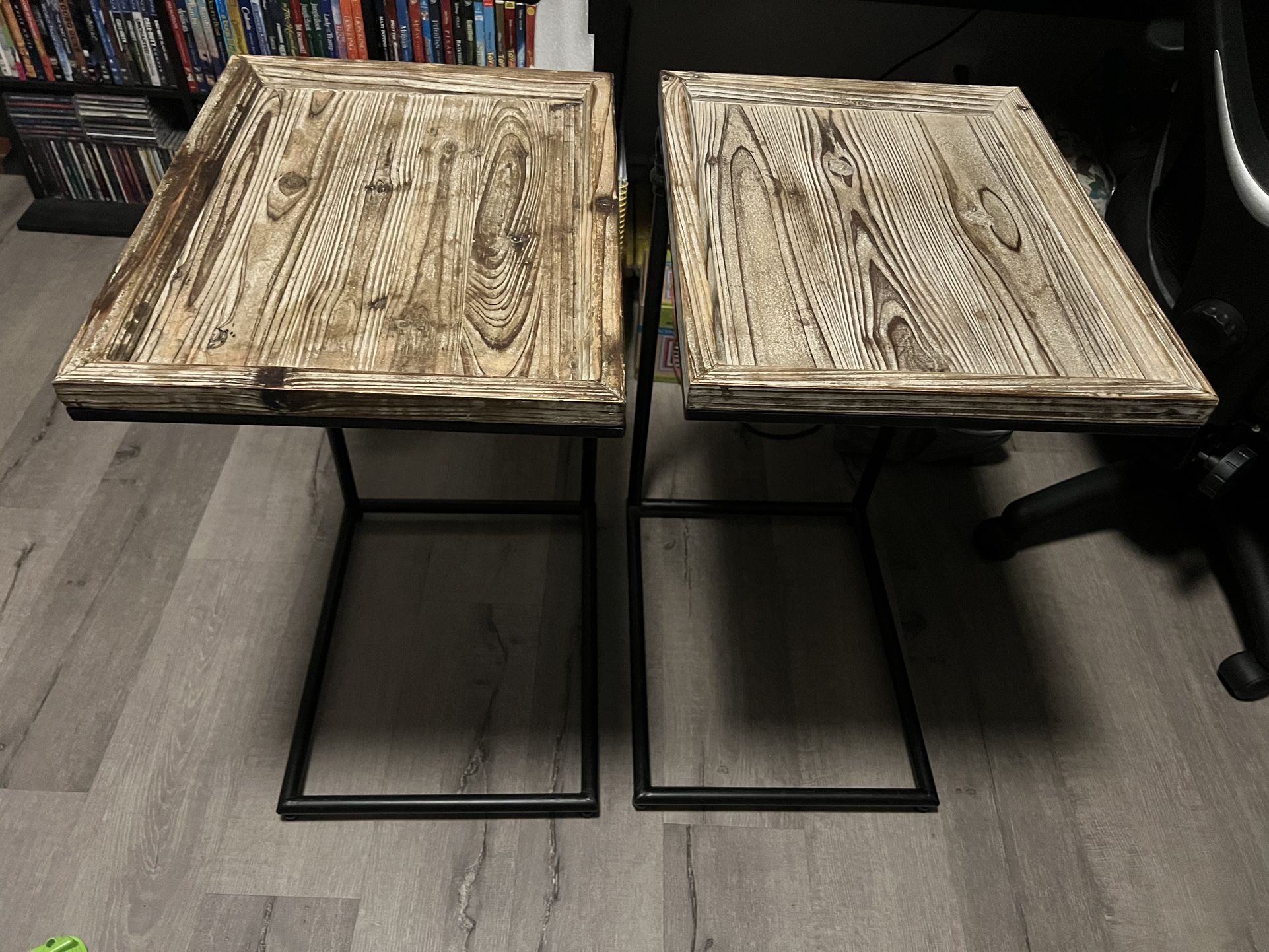 Pair of wood and metal end tables. One side is open, perfect to slide under couch and use as table. We love them but don’t fit with our new couch.