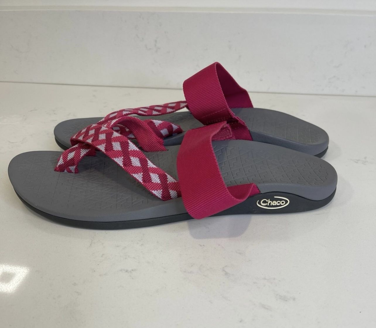 Chaco Tetra Cloud Toe Loop Slide Sandals in a vibrant BRAID BERRY color. Designed with a women's US size 10, these slides are perfect for those seeking a blend of fashion and function. The synthetic upper material ensures durability, while the slip-on style offers easy wearability for any casual occasion Smoke Free Home If you have any questions please let me know.