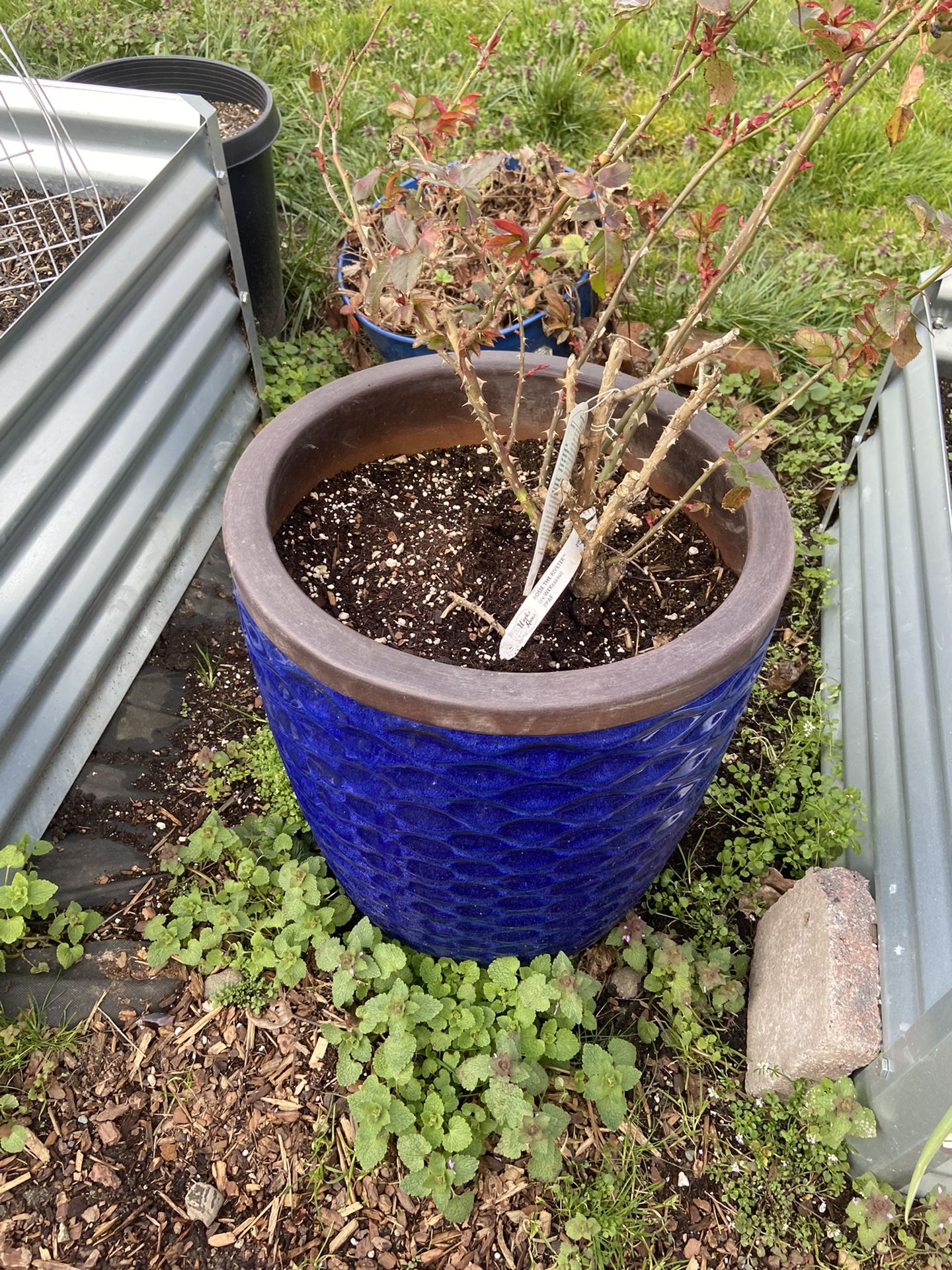 Big Blue Ceramic Pot Rose Bush Included (ROSE BUSH SOLD)