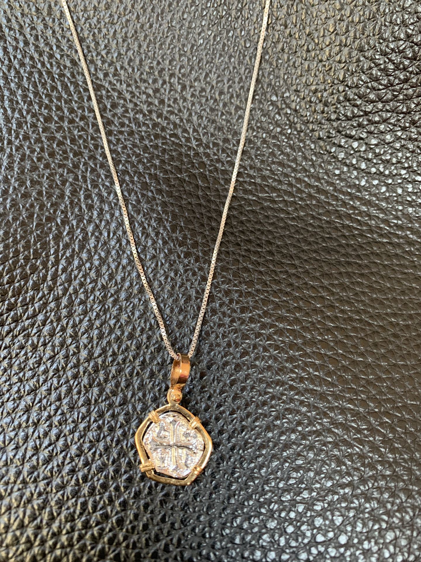Atocha silver coin pendant in gold bezel with silver chain