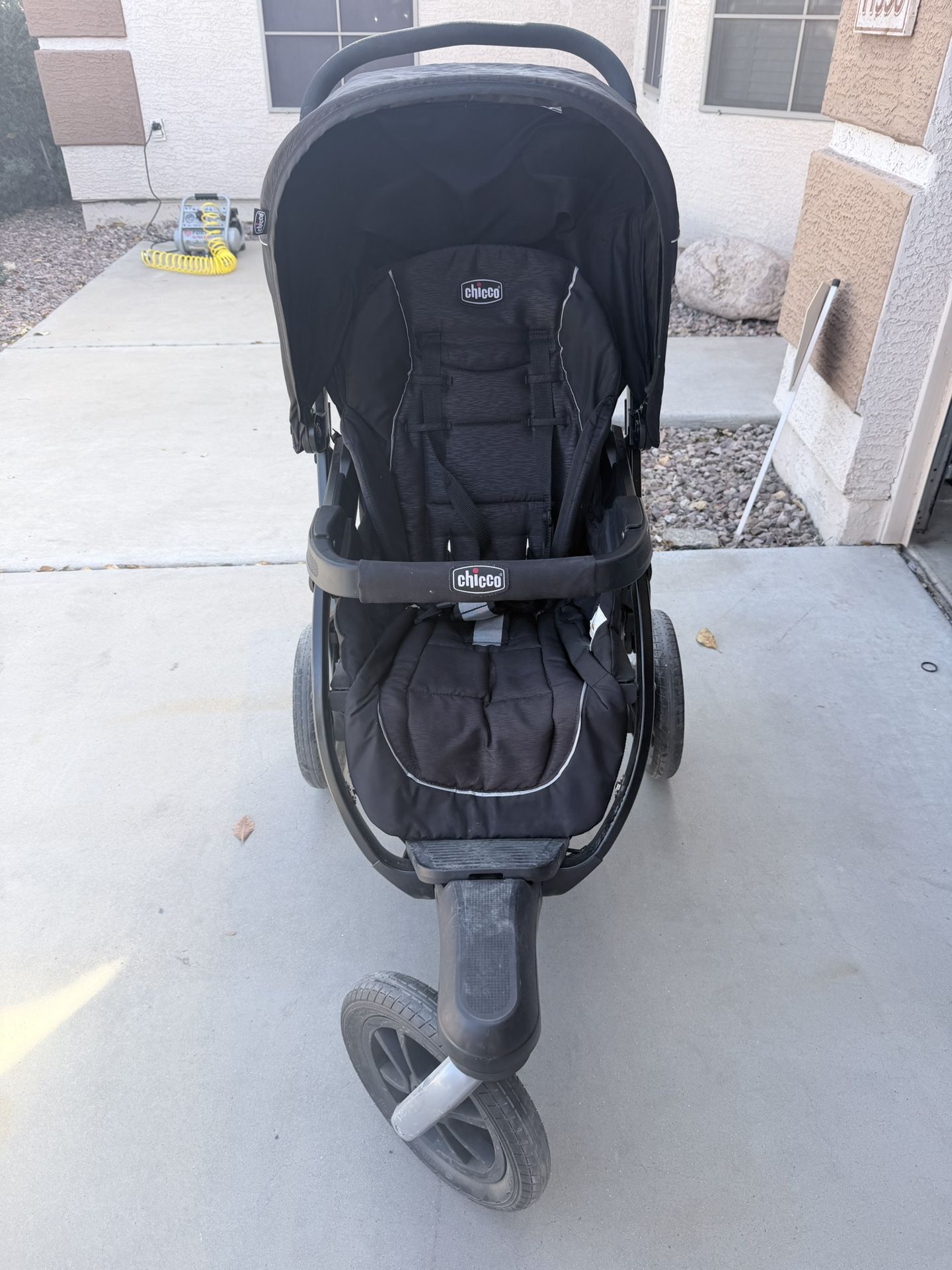 Lightly used, high-performance Chicco jogging stroller. Perfect for both paved trails and rugged terrain. Features a hand-operated hand brake and swivel lock for ultimate safety and control. Folds easily with one hand and includes a massive canopy with excellent sun protection. Clean, smoke-free home.