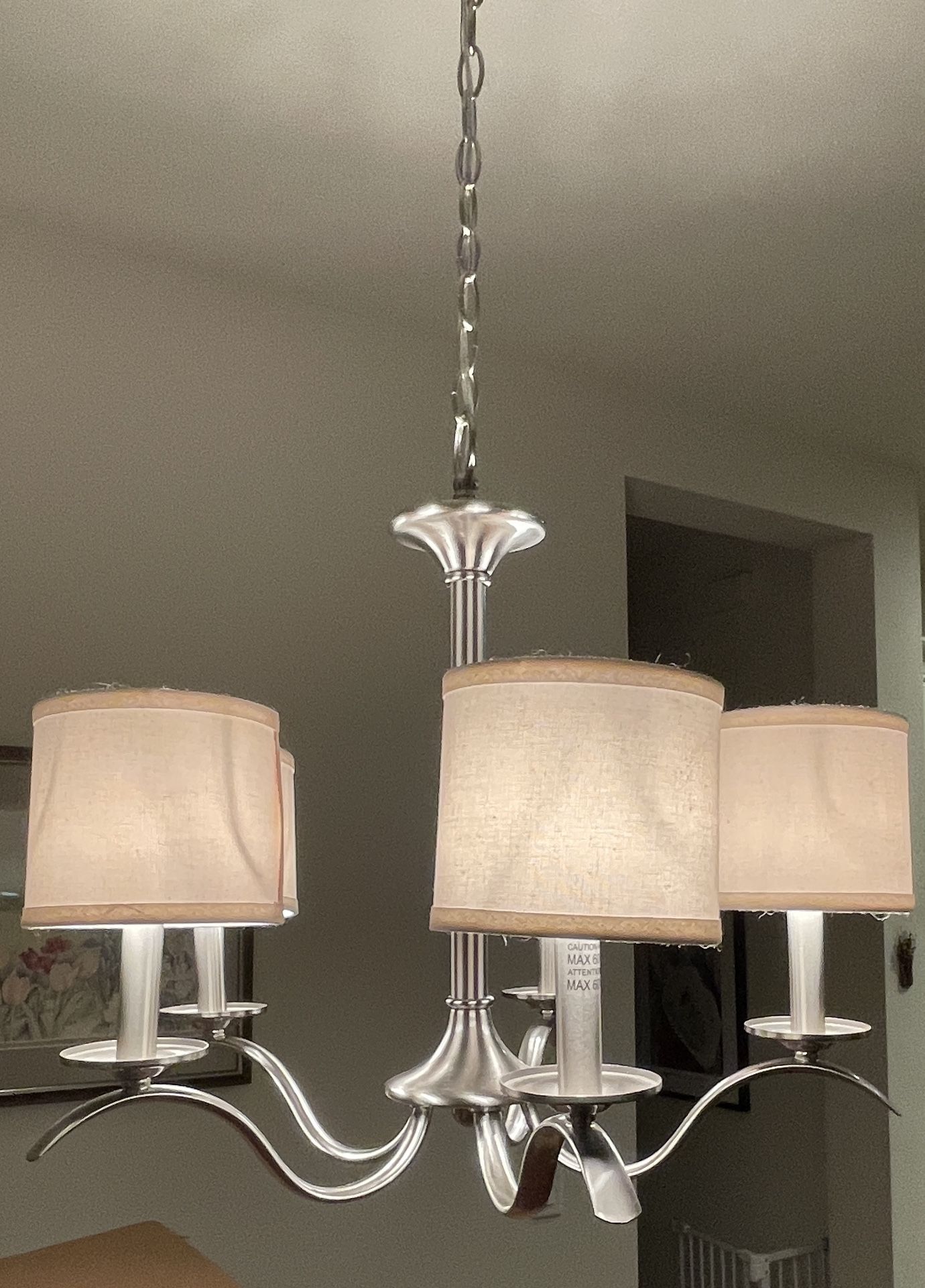 Dimmable. Brushed nickel with off white shades. 20 inches in diameter.