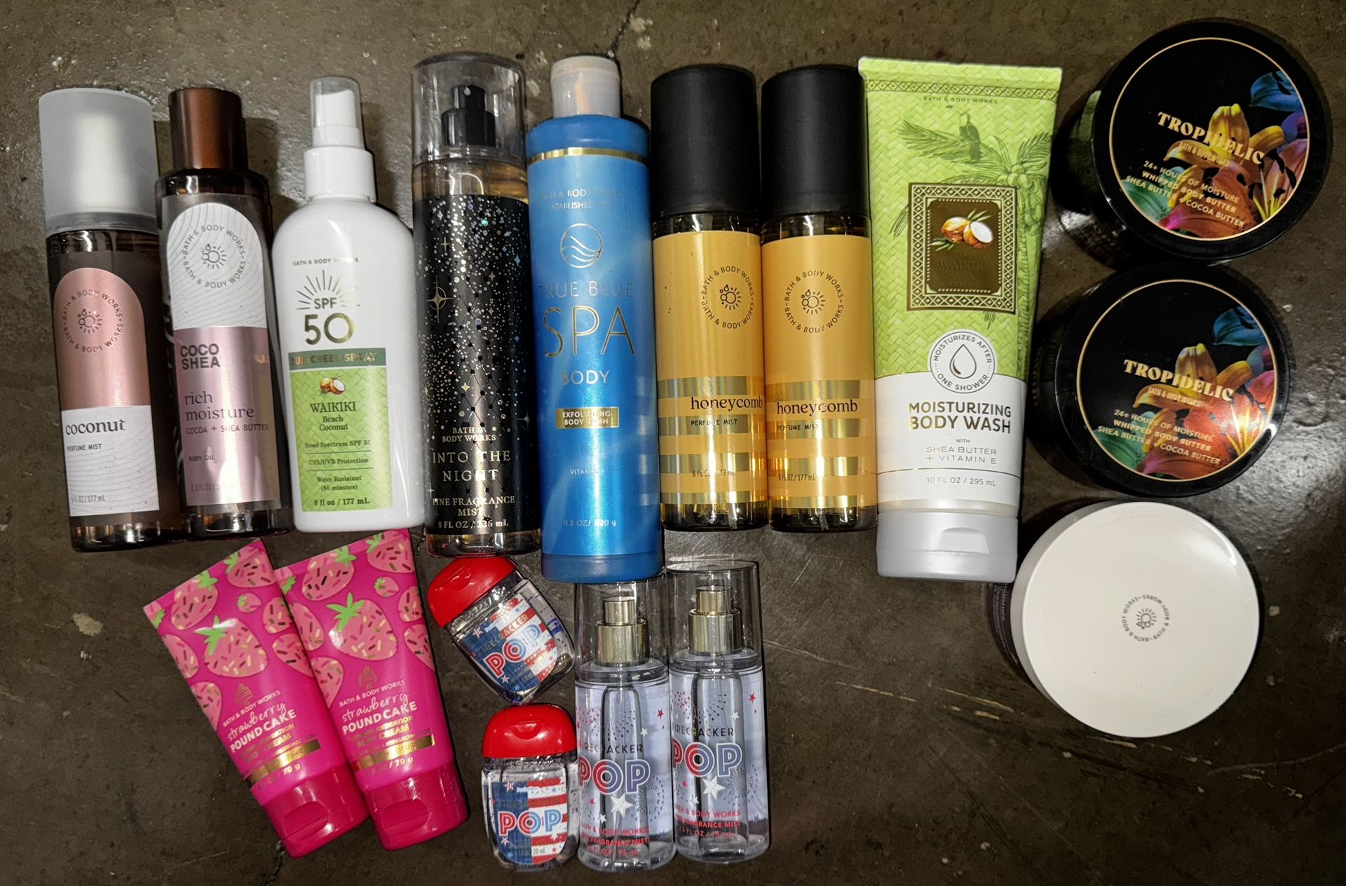 •Tropidelic body butter •Cocoa Shea body butter •Waikiki moisturizing body wash •Honeycomb perfume mists •True blue spa body exfoliating body wash •Into the night fragrance mist •Waikiki spf 50 •Cocoa Shea body oil •Coconut perfume mist •Travel size Strawberry Pound Cake body lotion •Travel size Firecracker Pop fragrance mist & PocketBac All new $35