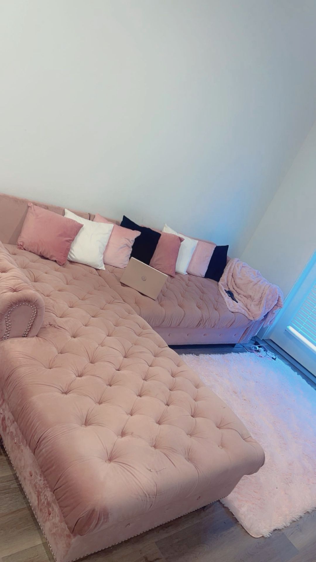 Huge Soft Pink sectional, has a couple of popped up buttons, but can be fixed. Does have some spots on it but will come clean with steam cleaner. PICKUP ONLY. If you have any other questions regarding the couch, please feel free to ask away π (Pillows not included)