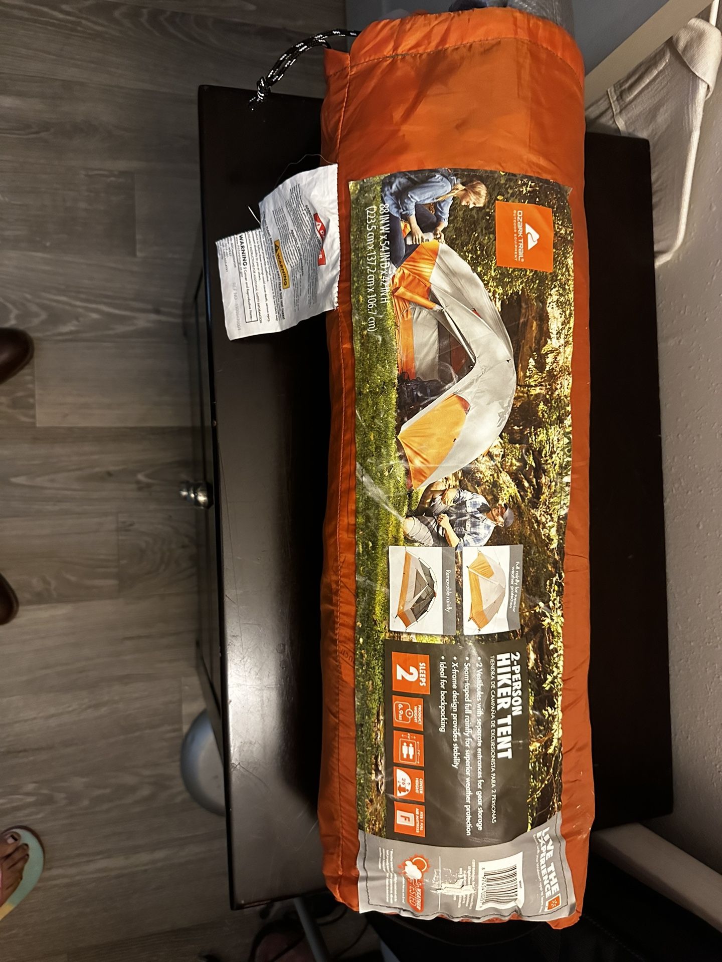 2 person hiker tent 3’6” high Fits 1 full air mattress Comes with rain fly