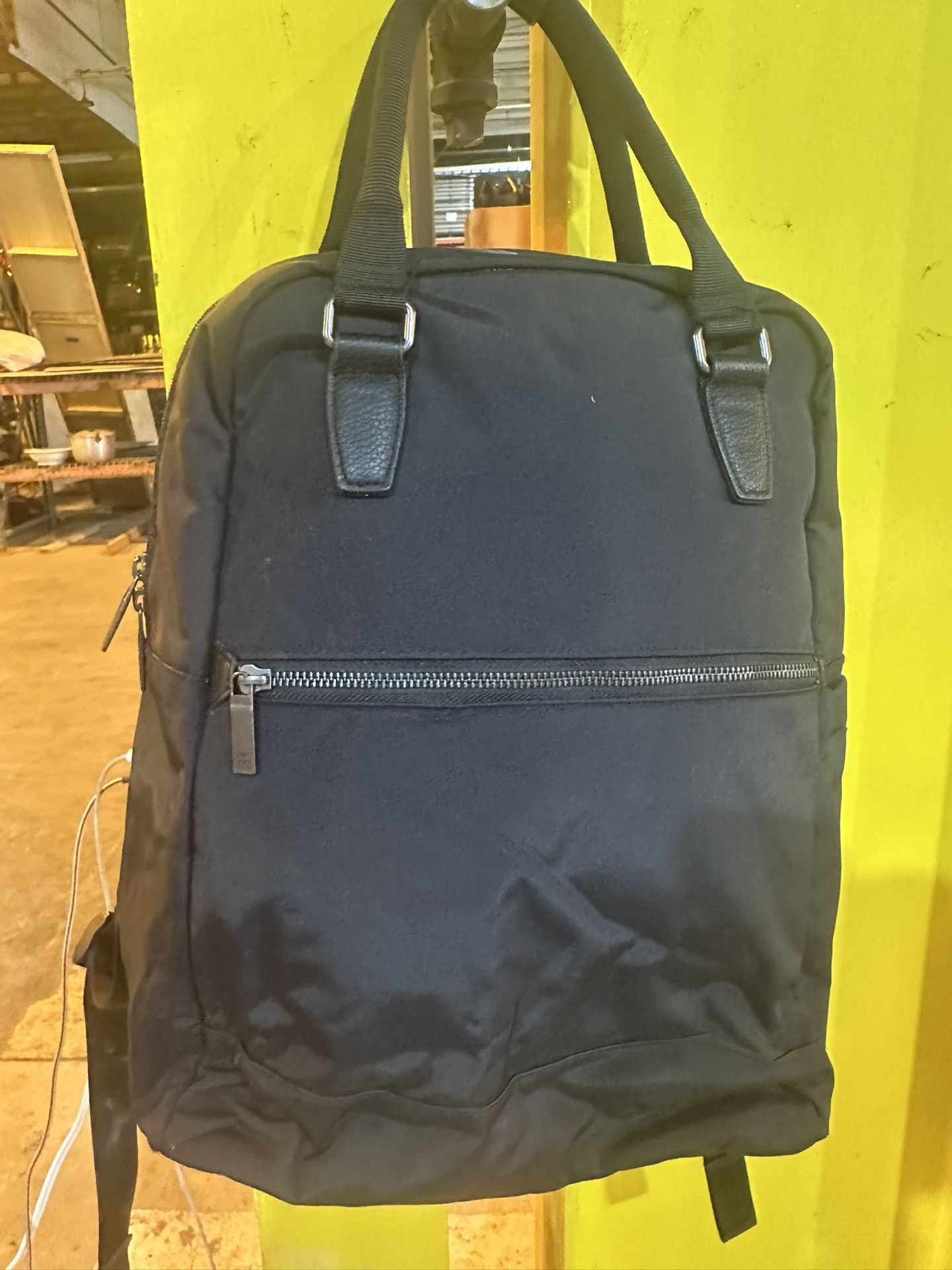 Unbranded black nylon backpack with convertible tote handles. Features a full-length front zipper pocket, side slip pockets, and padded adjustable shoulder straps. Can be carried by top handles or worn as a backpack. Simple, utilitarian design suitable for everyday use, commuting, or travel. No visible branding or logos. Moderate wear and wrinkling from storage but no rips, tears, or major defects. Measurements (approx): • Height: 16” • Width: 12” • Depth: 4” • Handle drop: 4.5” • Strap length: Adjustable Condition: Gently used with some cosmetic wear. Zippers work smoothly. Interior and exterior clean.