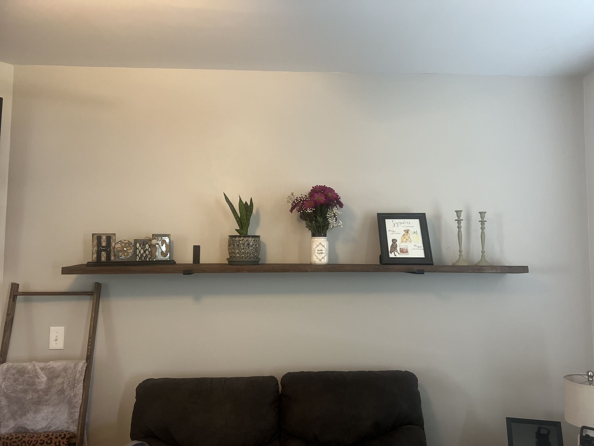 I have these shelves with the brackets. I have multiple lengths and can cut it shorter if needed. Can stain with a honey colored stain or paint black or white for an upcharge of $5. Let me know the length you need!